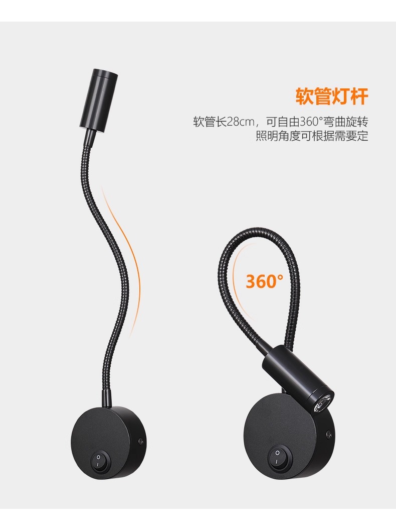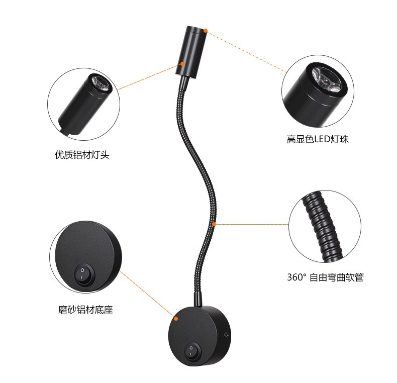 LEDホース射1W3W明装ベッドサイド読書エルボ写真鏡前テレビ背景壁