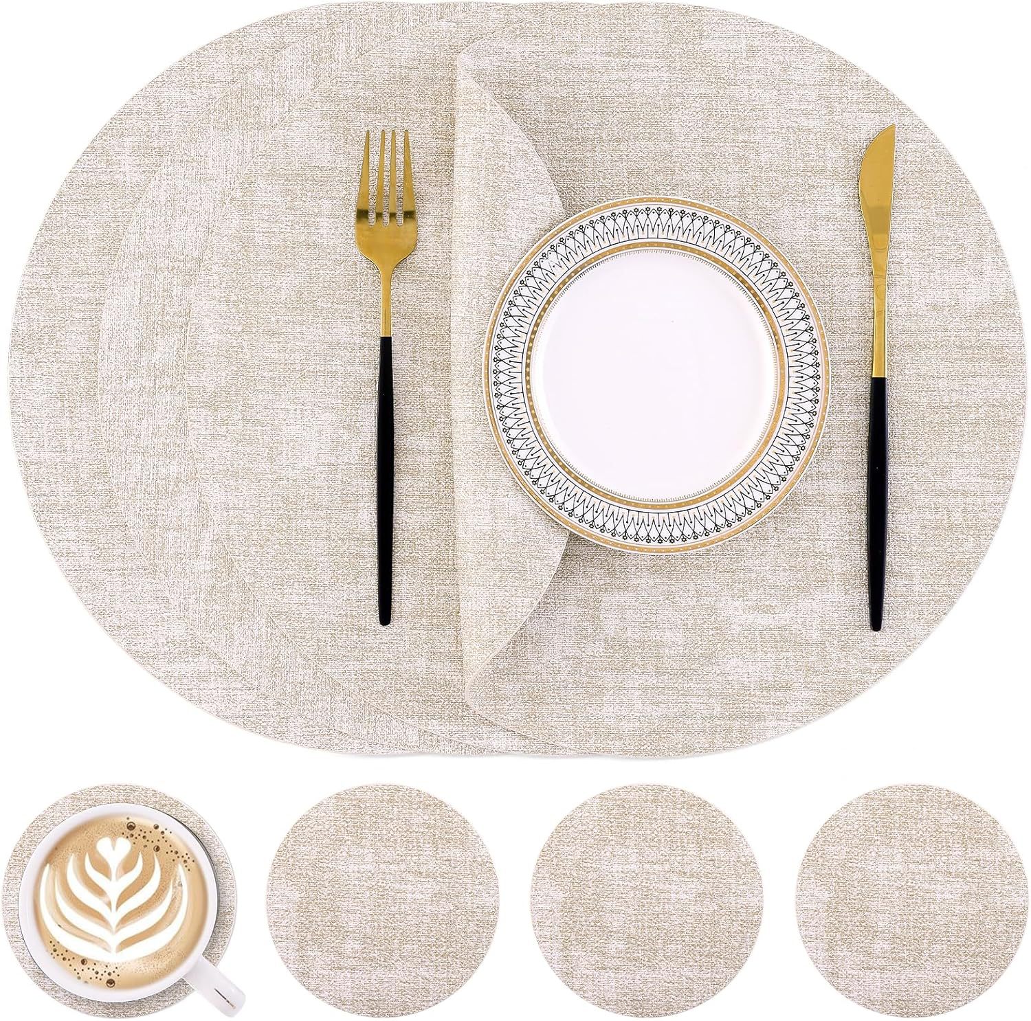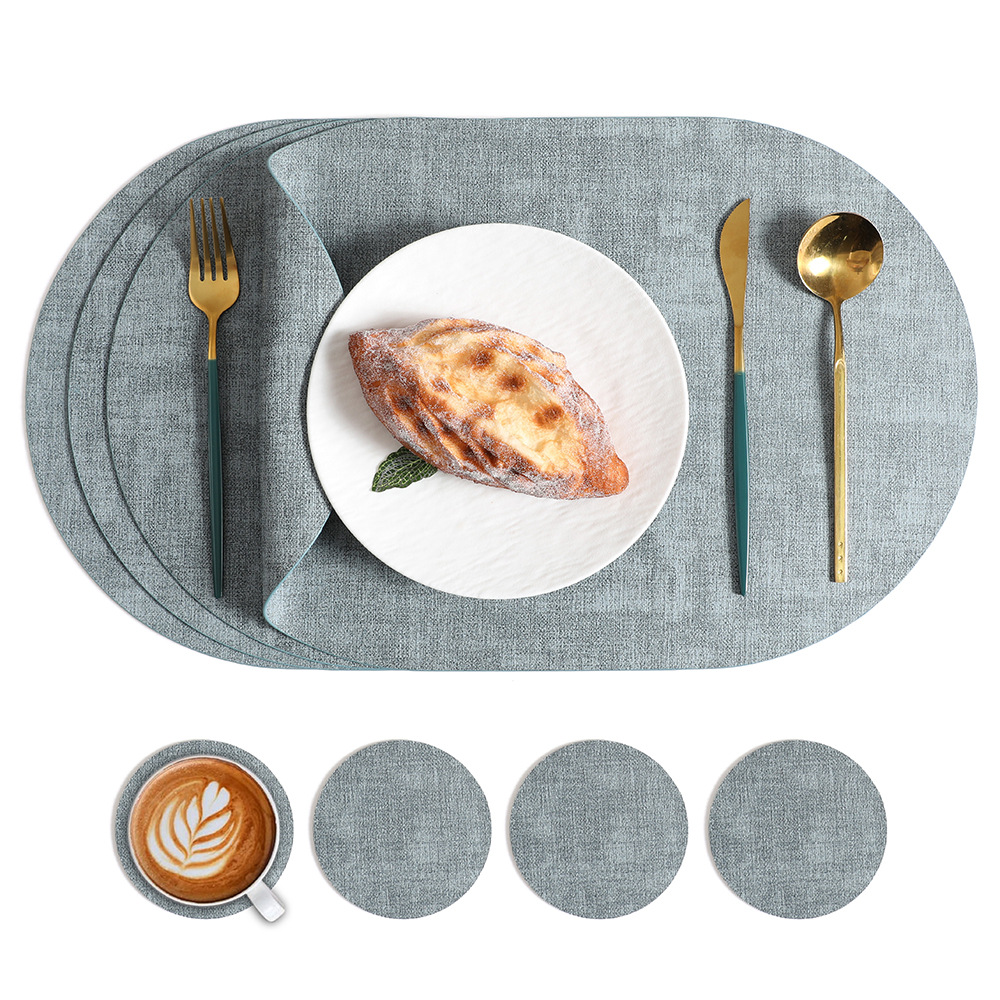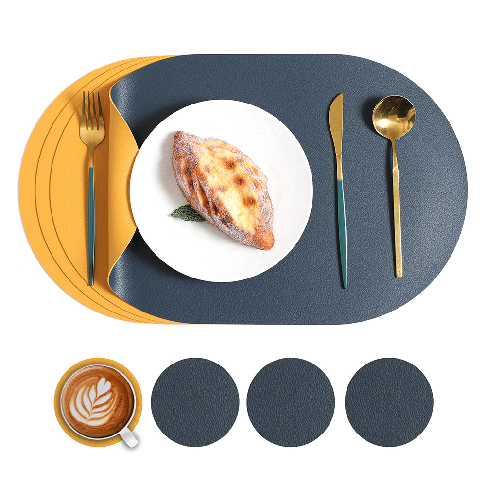 北欧風インスレザー製プレースマット、ツートンカラー食器、楕円形テーブル、高級感、洋食プレート、耐熱断熱マット