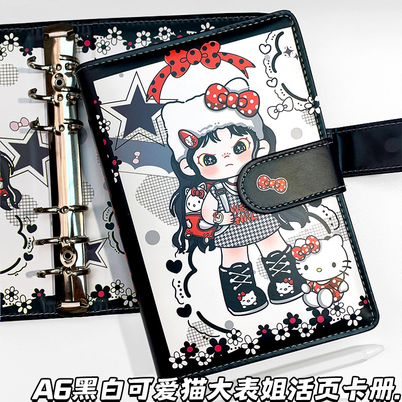 新款黑白大表姐A6收纳册潮酷卡通可爱猫小卡磁扣卡册pu活页笔记本