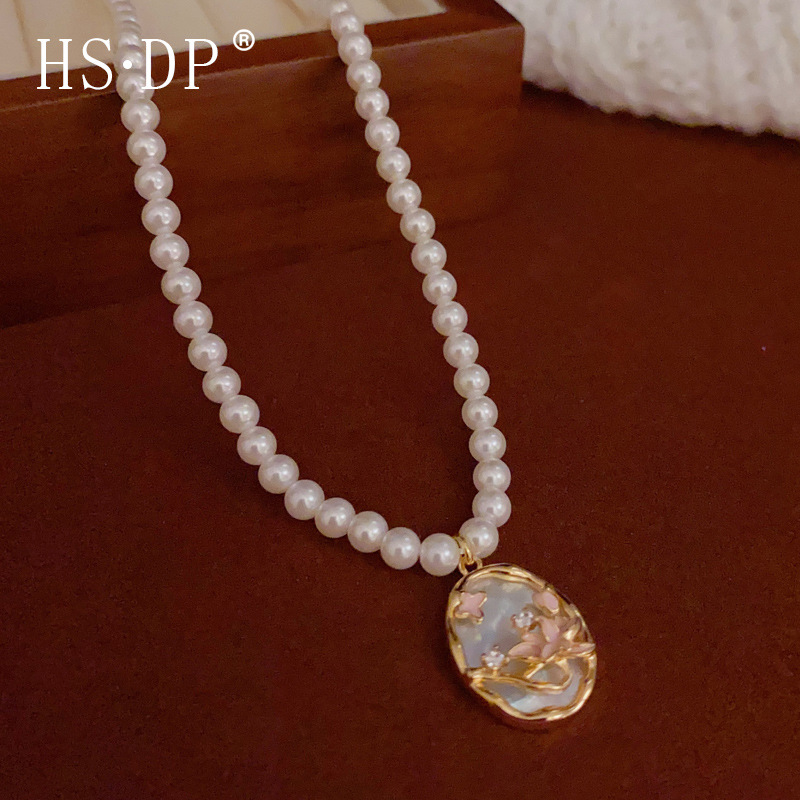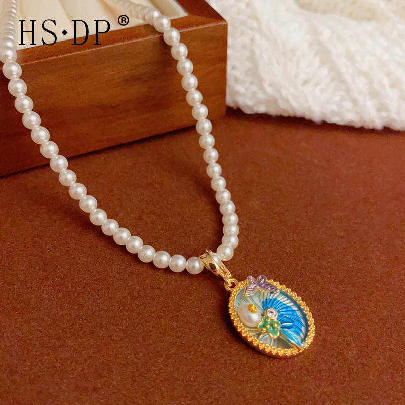 小衆新中国式油絵蝶円牌ペンダント真珠ネックレス気質ファッションシンプルな鎖鎖鎖卸売り