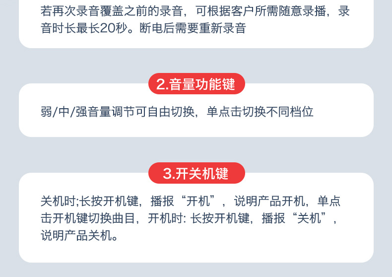 产品规格 【电池款】12种语音,【充电款】19种语音,【充电款】12种语音+可录音,【充电/电池两用】12种语音+可录音,【电池升级款】20种语音+可录音,【充电升级款】20种语音+可录音,【充电款】20种语音+可录音,【电池款】20种语音+可录音,【电池款】25种语音+6挡音量调节,【电池款】25种语音+6挡音量调节+带遥控器,【充电款】25种语音+带遥控器