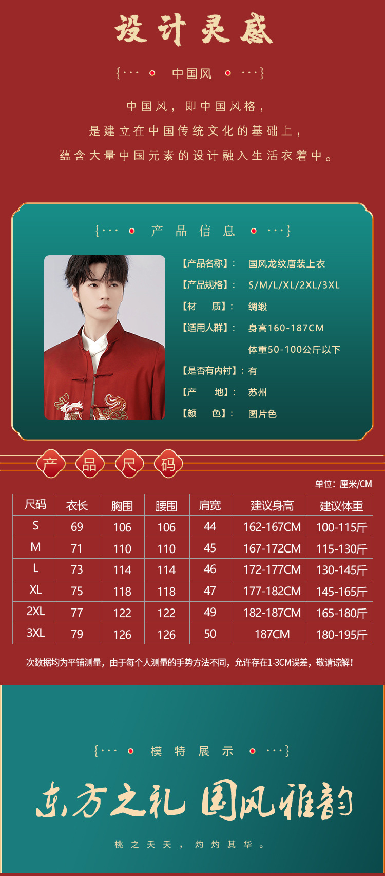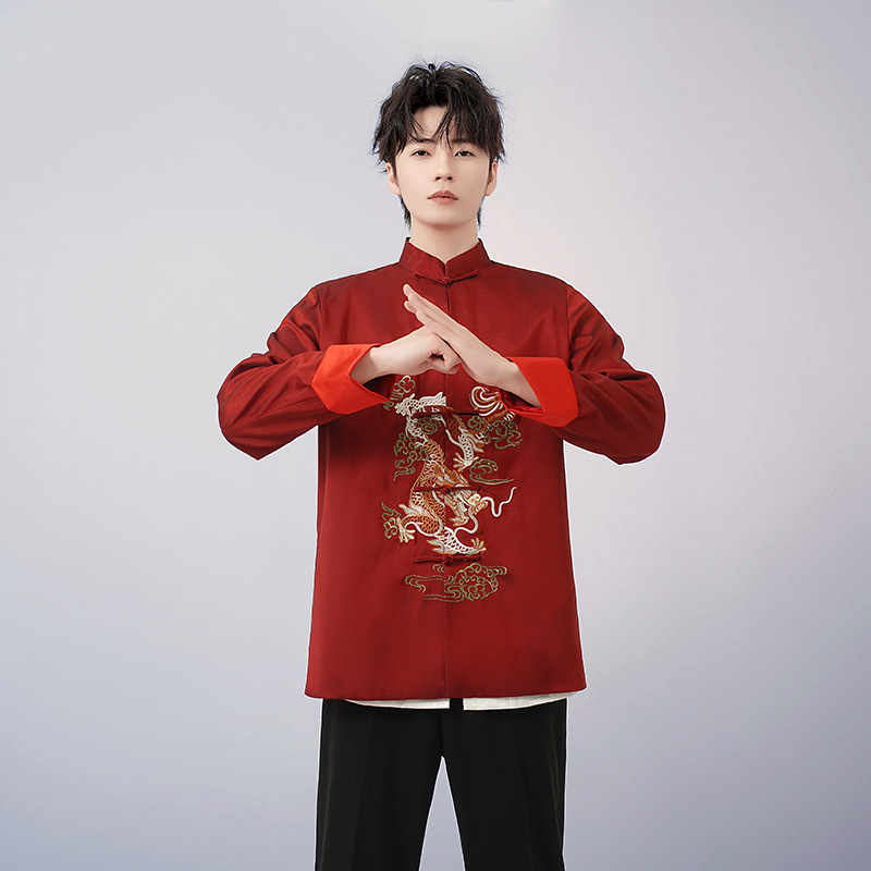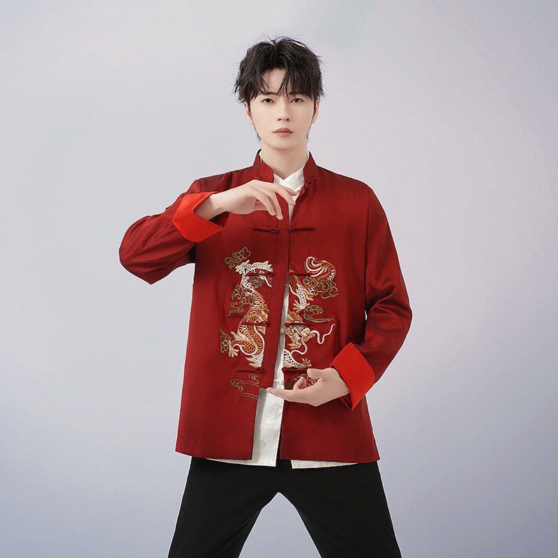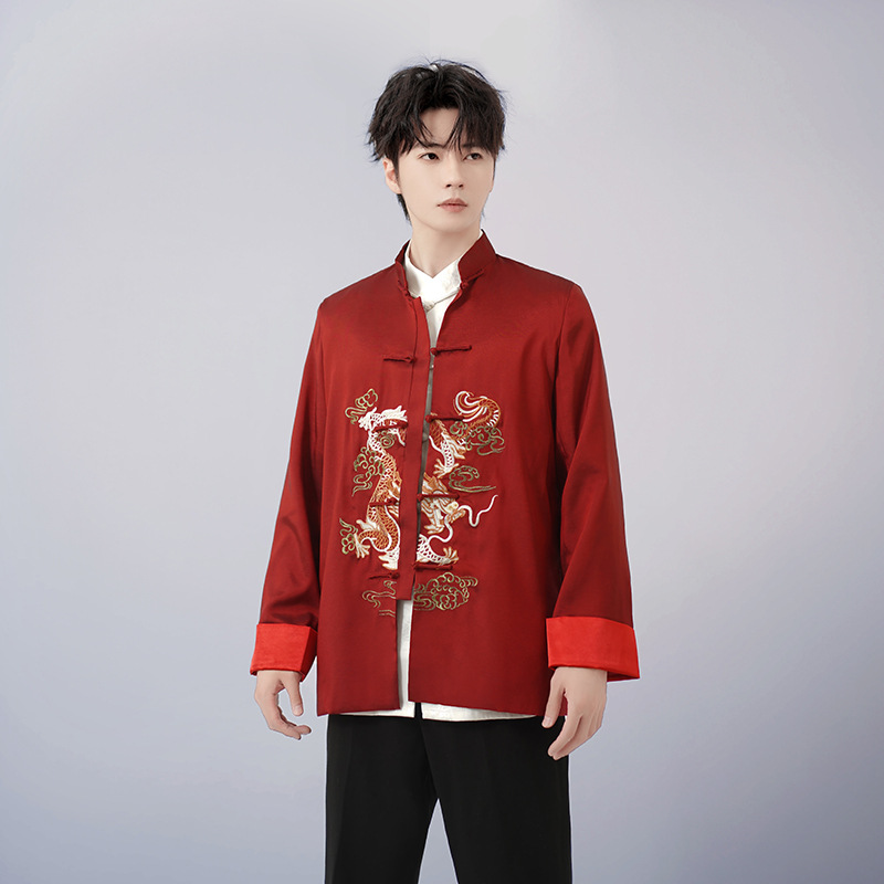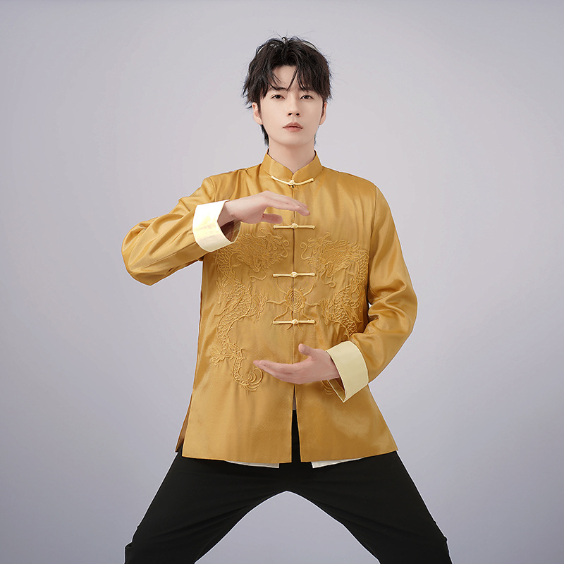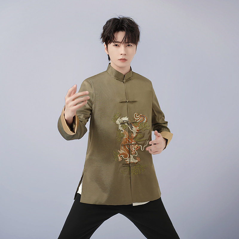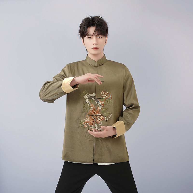 中高年唐装ドレス春秋コート男性唐装長袖上着民族風中国式復古刺繍龍上着