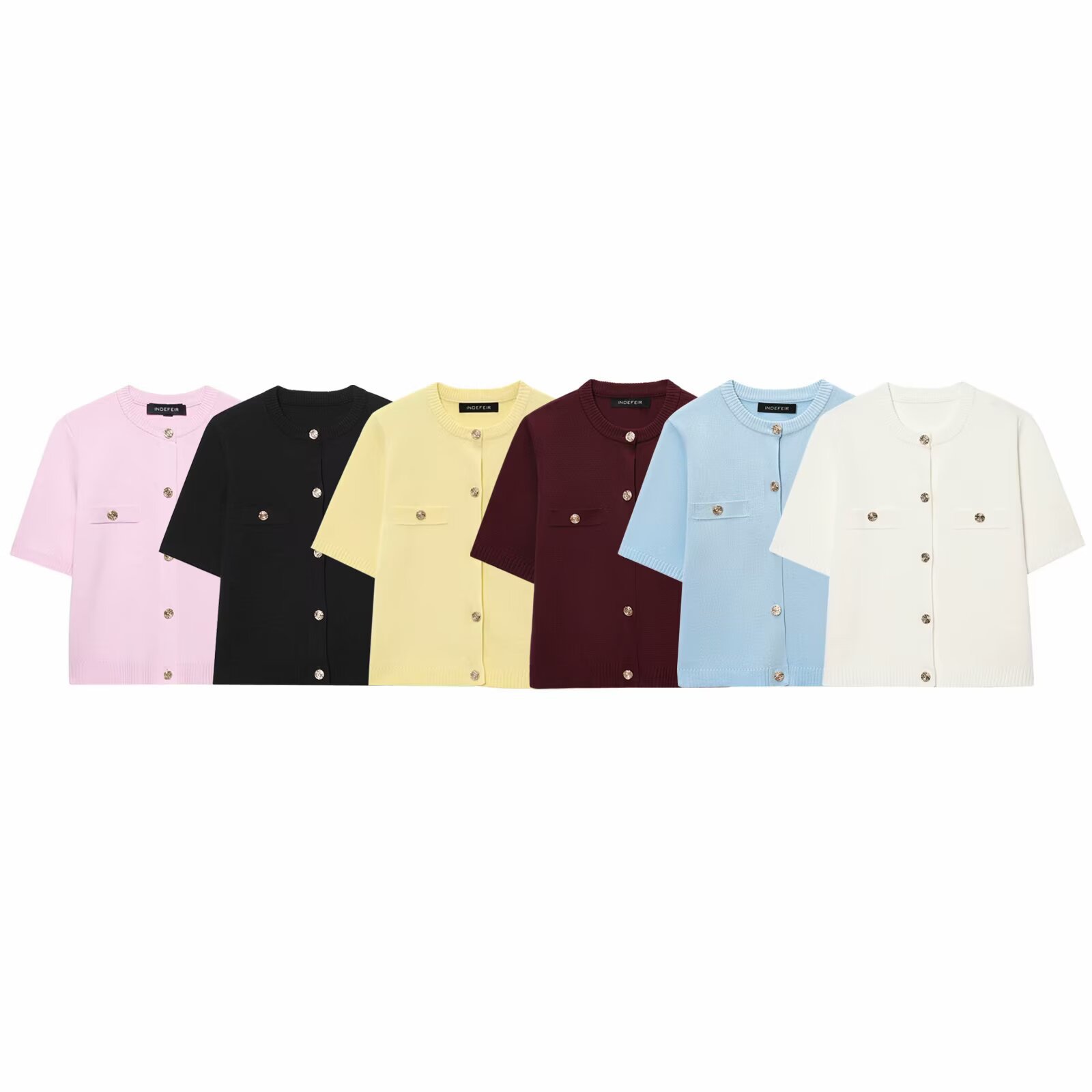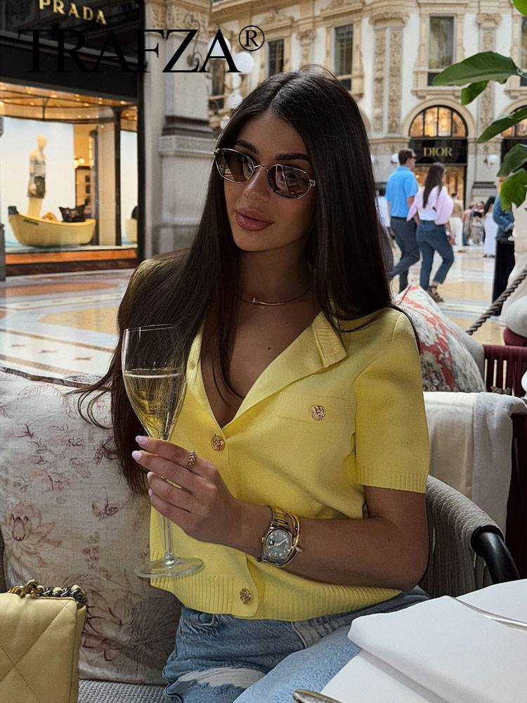 欧美跨境女装2025秋季新款气质翻领撞色修身短袖百搭针织开衫上衣