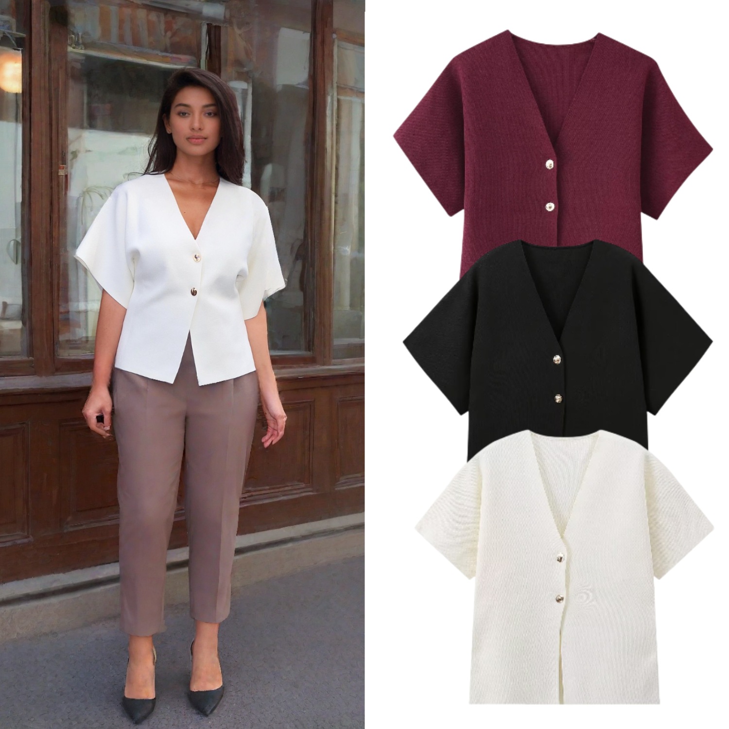 亚马逊女装批发2025夏季新款欧美风简约百搭平针短袖V领针织衫