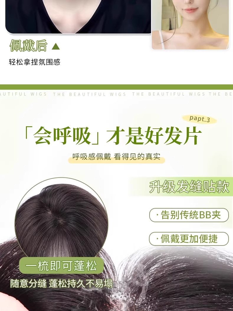 假发女无需发卡中分刘海头顶补发片蓬松自然仿真发魔术贴假发片