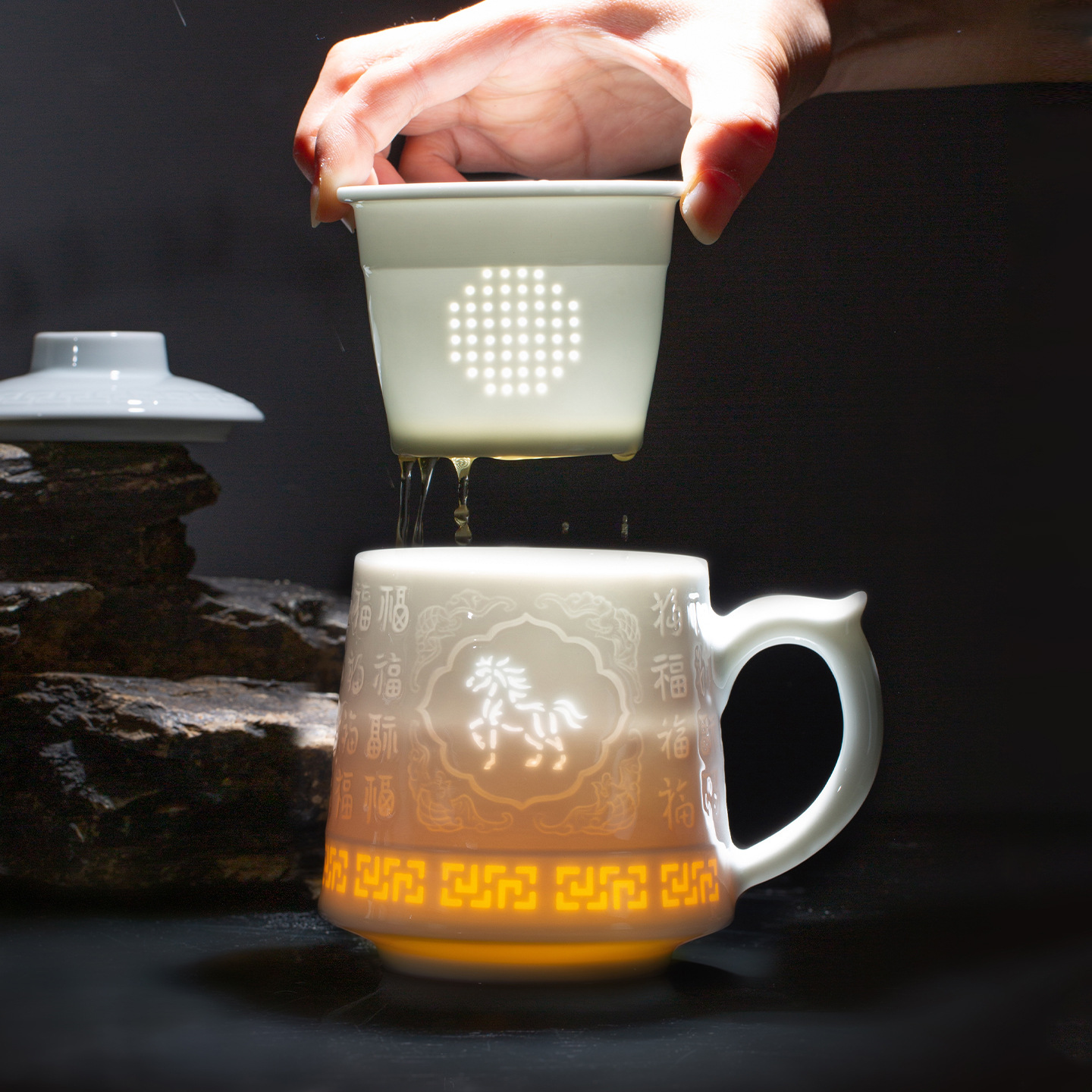 玲珑青瓷百福图雕刻陶瓷茶杯两件套水杯家用中式办公泡茶杯