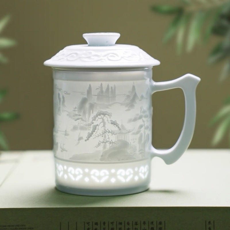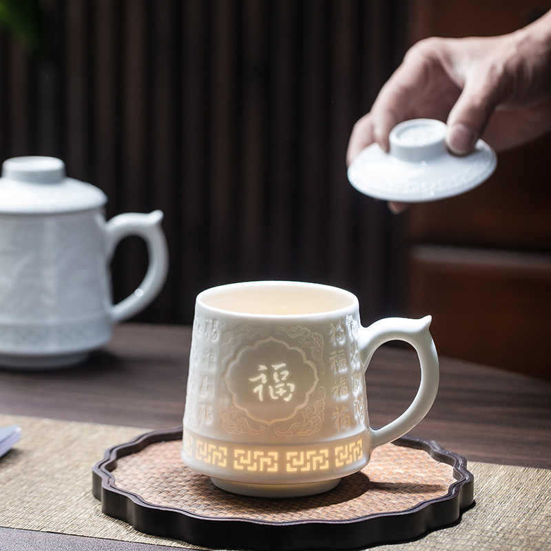 羊脂玉瓷雕刻陶瓷茶杯两件套水杯家用中式办公泡茶杯