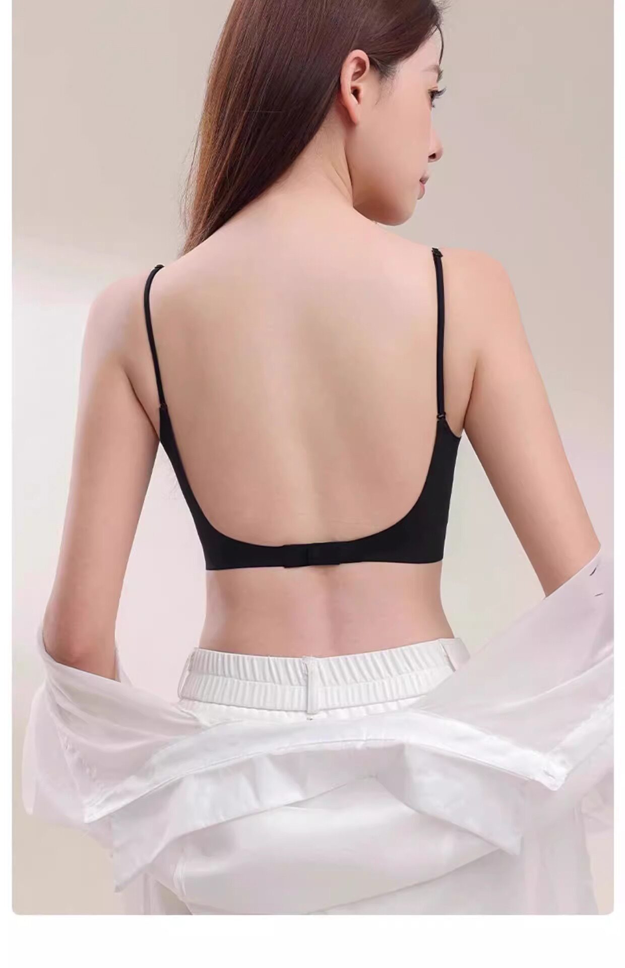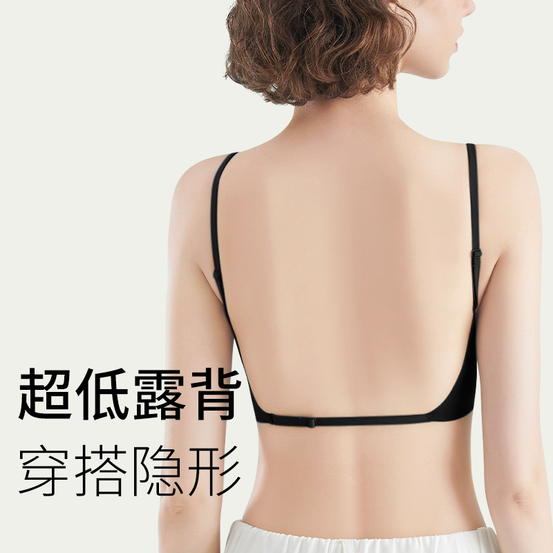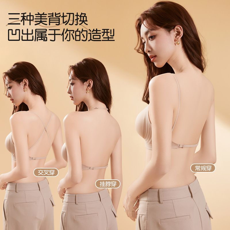 跨境u型大露背细肩带粉底液美背内衣女夏聚拢小胸无痕挂脖文胸罩