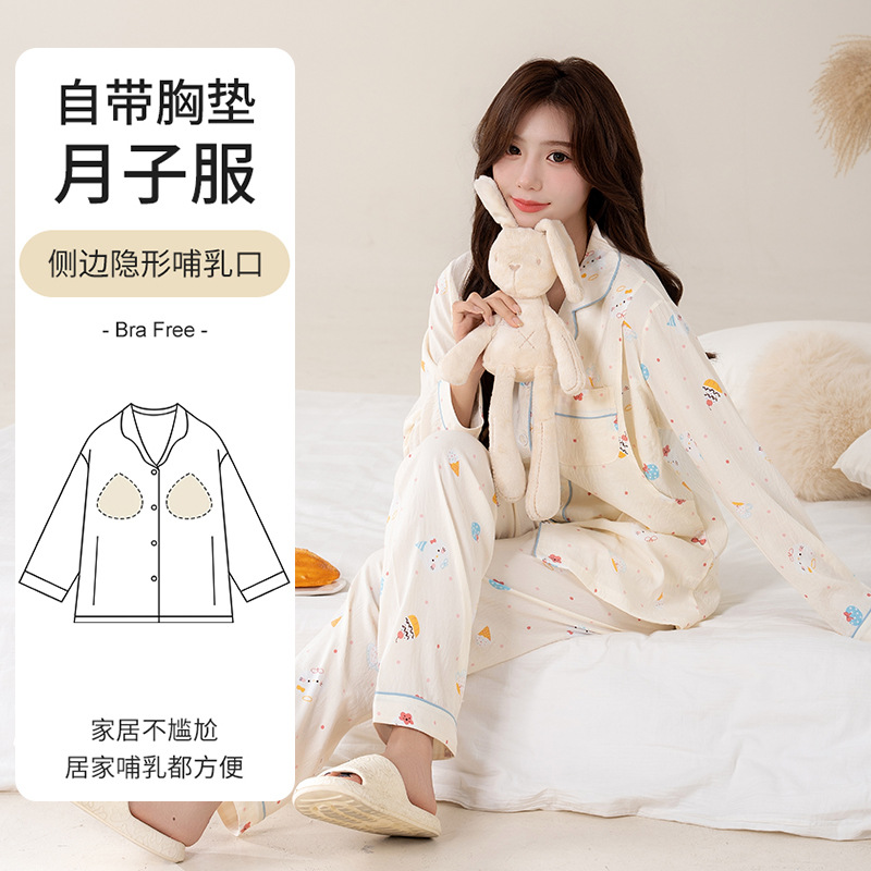 220克40支精梳棉自带胸垫月子服宽松哺乳睡衣秋产后孕妇喂奶套装