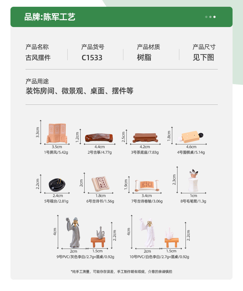颜色 1号屏风,2号古筝,3号茶底座,4号围棋桌,5号砚台,6号古诗书,7号古诗卷轴,8号毛笔筒,9号PVC/灰色李白+酒桌,10号PVC/白色李白+酒桌