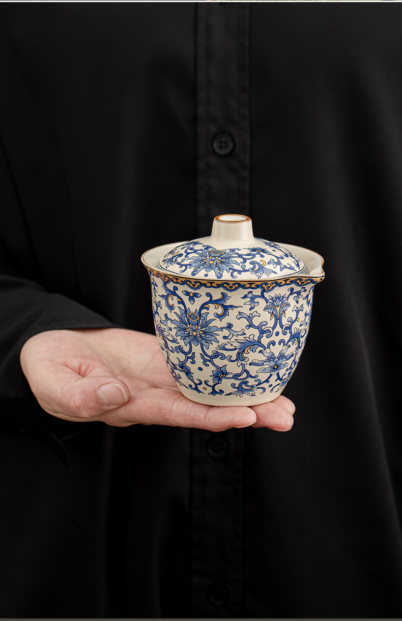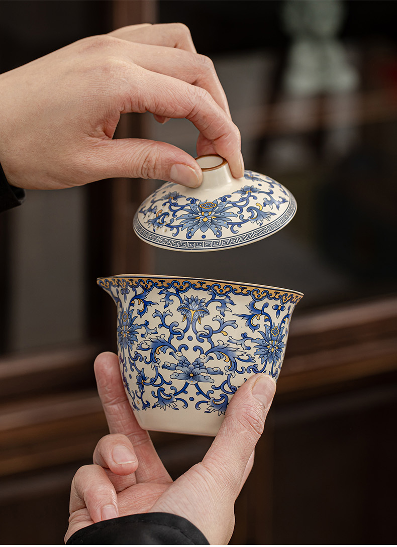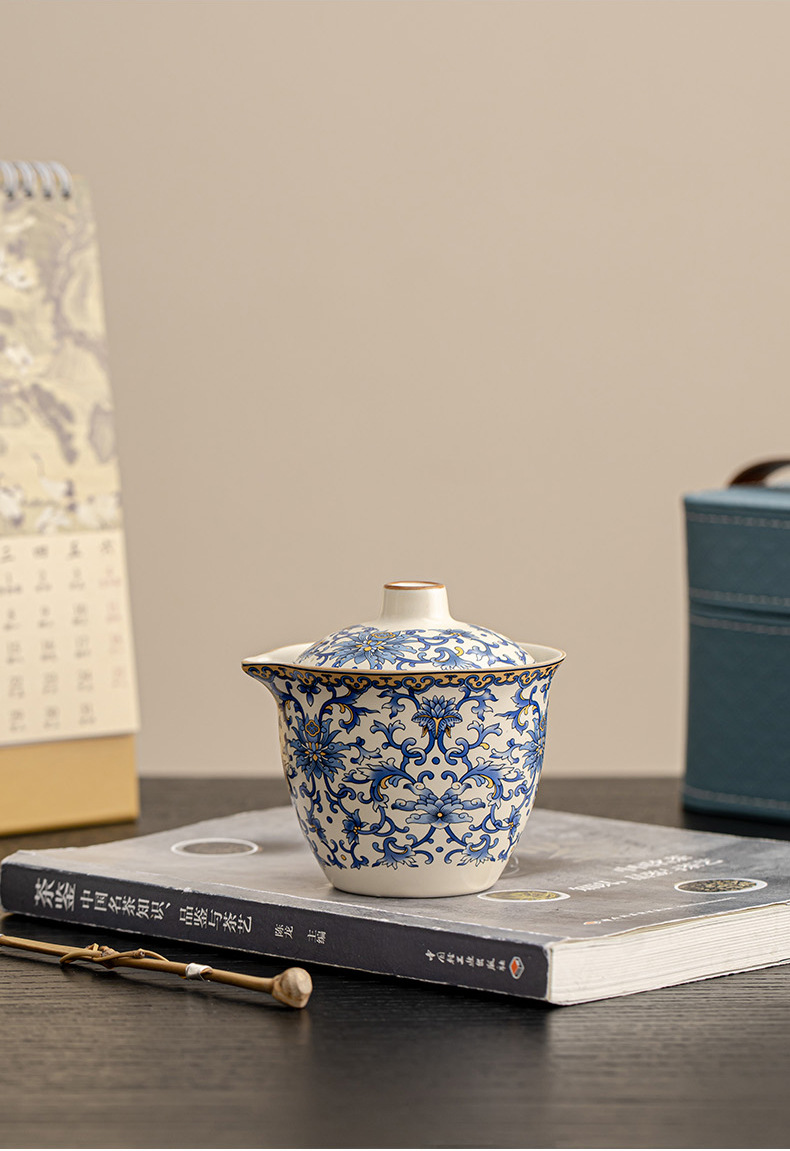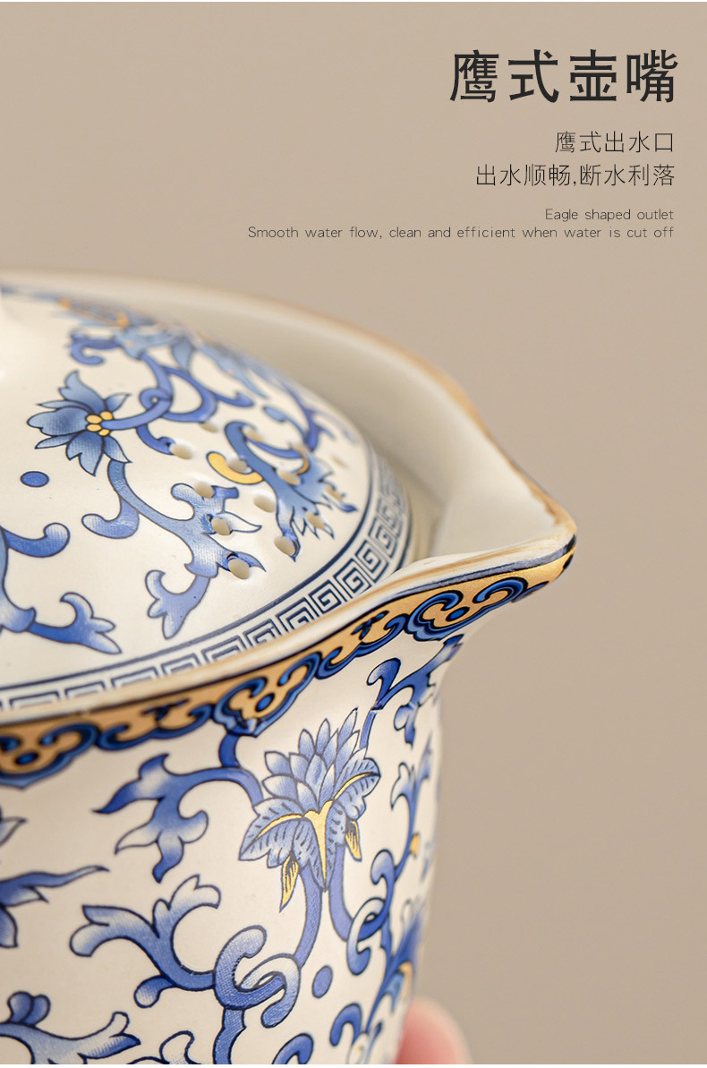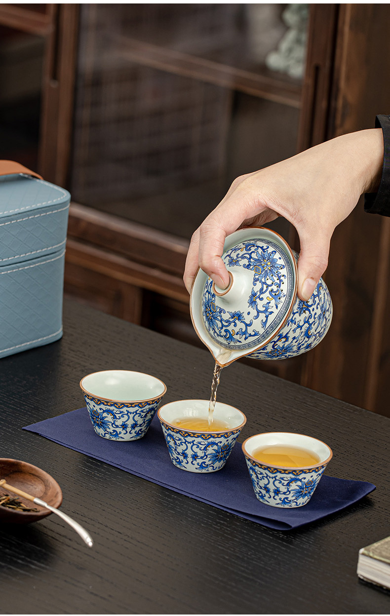 蓮柄ベージュ汝窯蓋ボウル旅行ティーセット小型セット 1 ポット 3 カップ屋外ポータブル青と白のクイックカップ