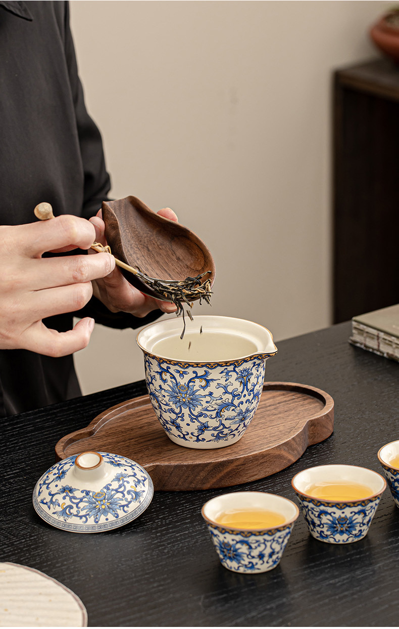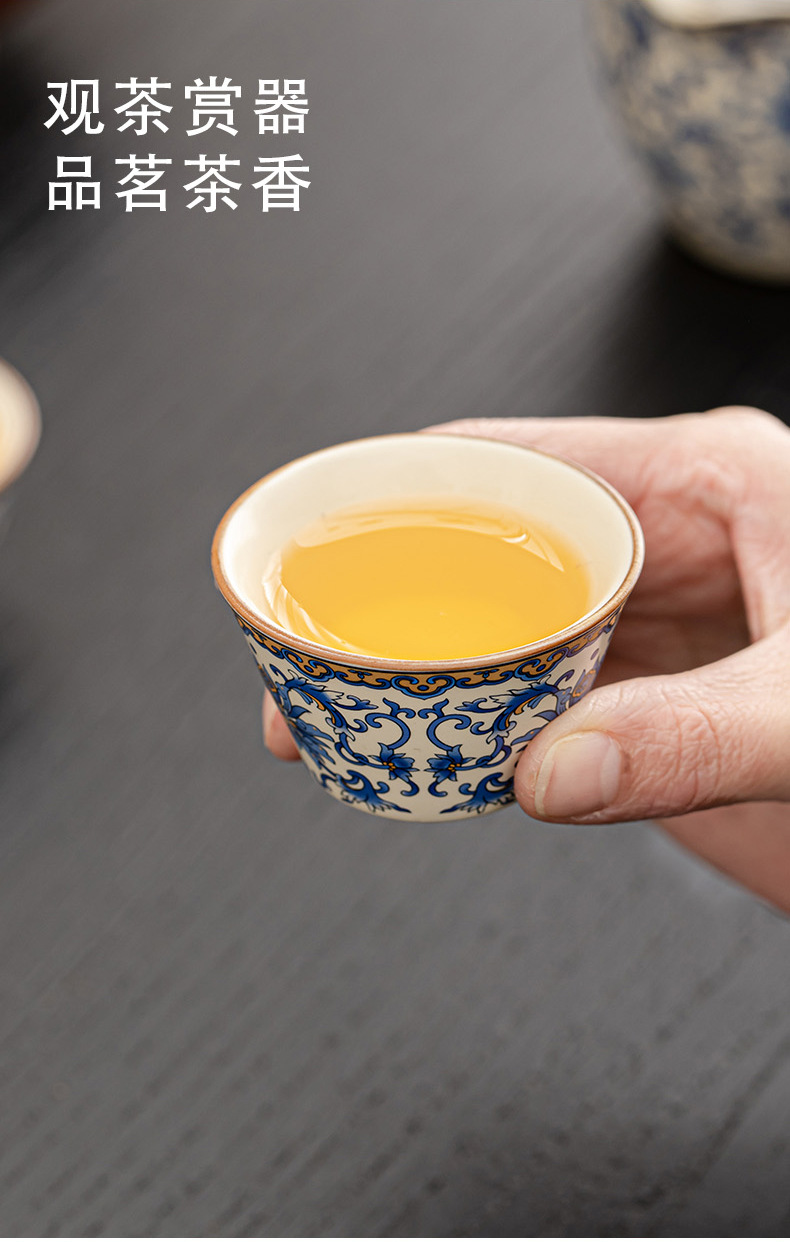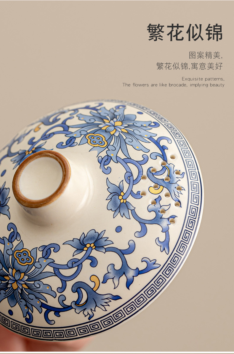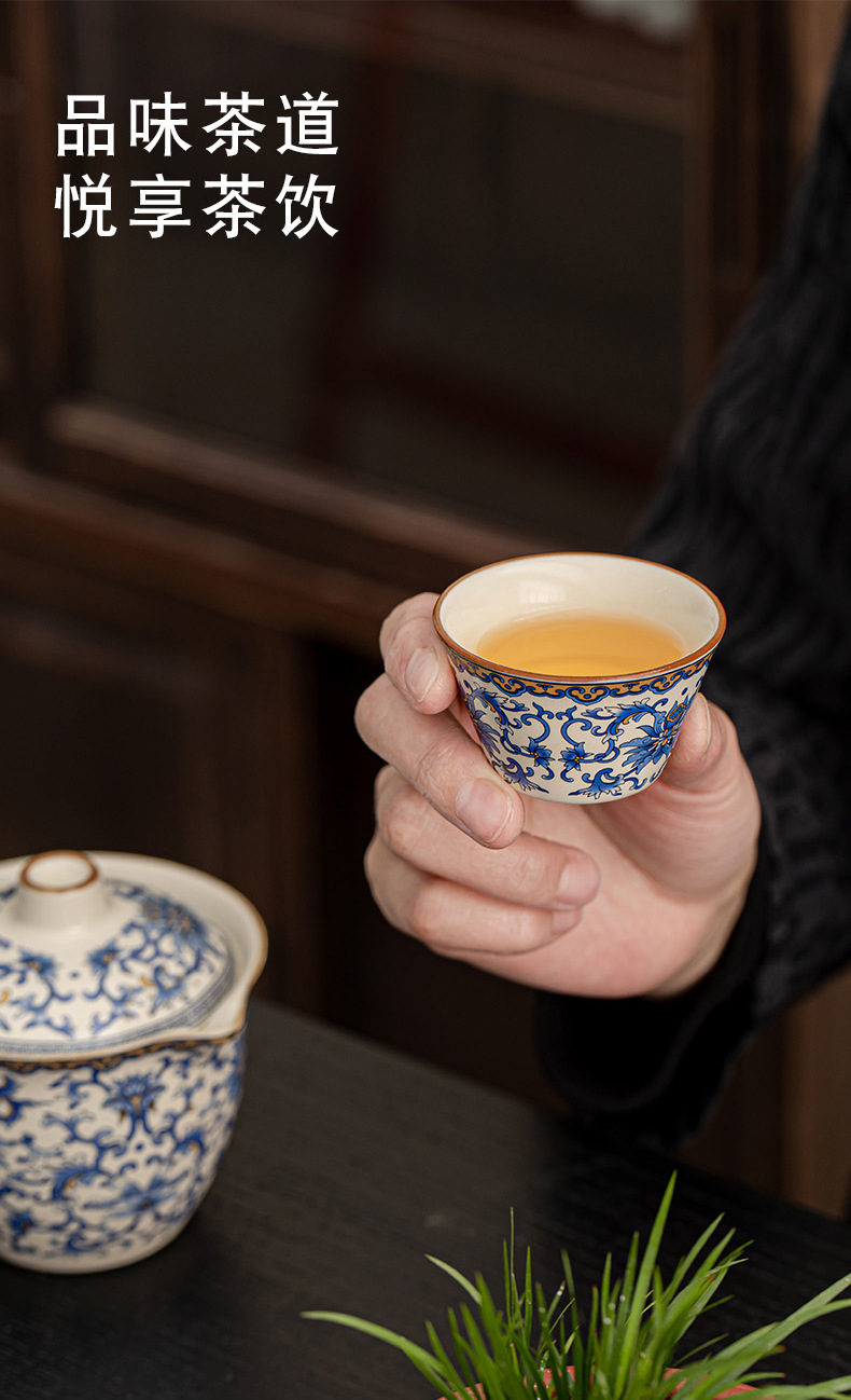 蓮柄ベージュ汝窯蓋ボウル旅行ティーセット小型セット 1 ポット 3 カップ屋外ポータブル青と白のクイックカップ