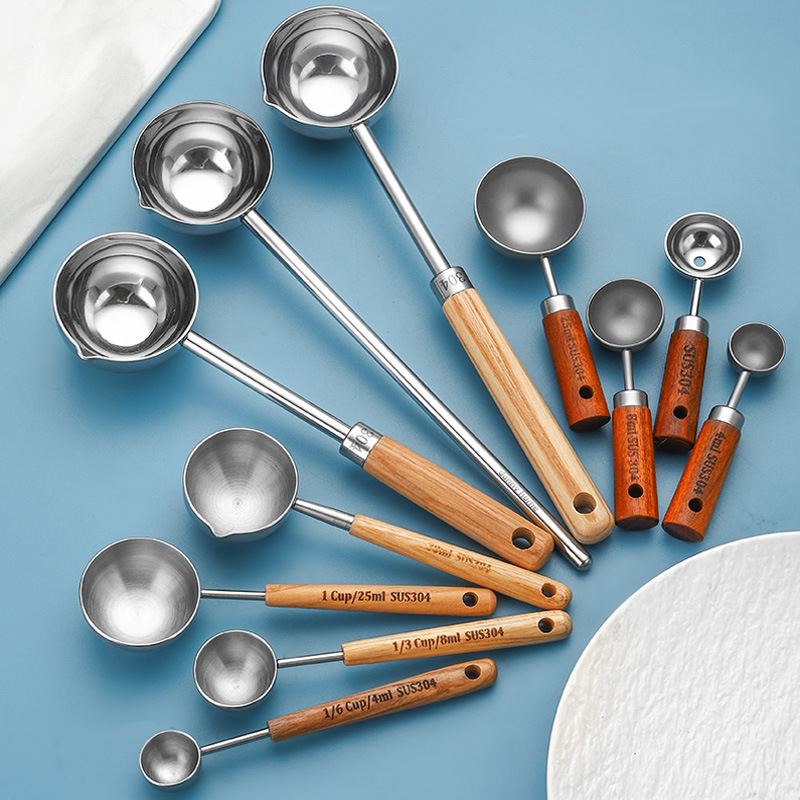 跨境热销不锈钢量杯量勺8件套相思木柄量杯量匙烘培工具4件套现货