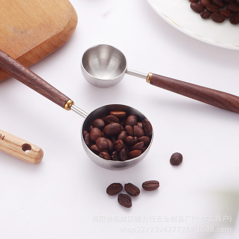锈钢胡桃木咖啡豆量勺长柄咖啡粉舀定量勺家用高颜值量匙勺
