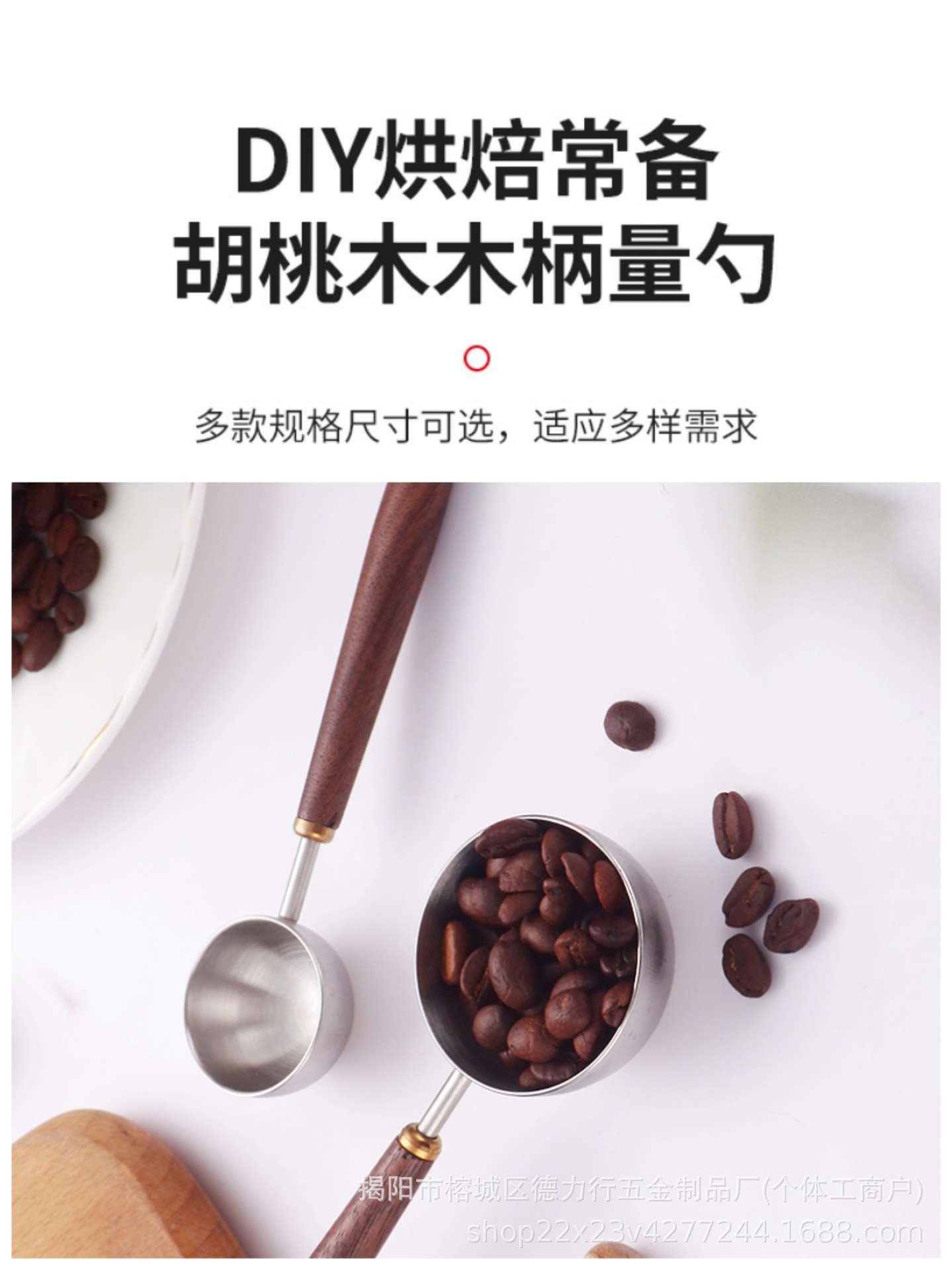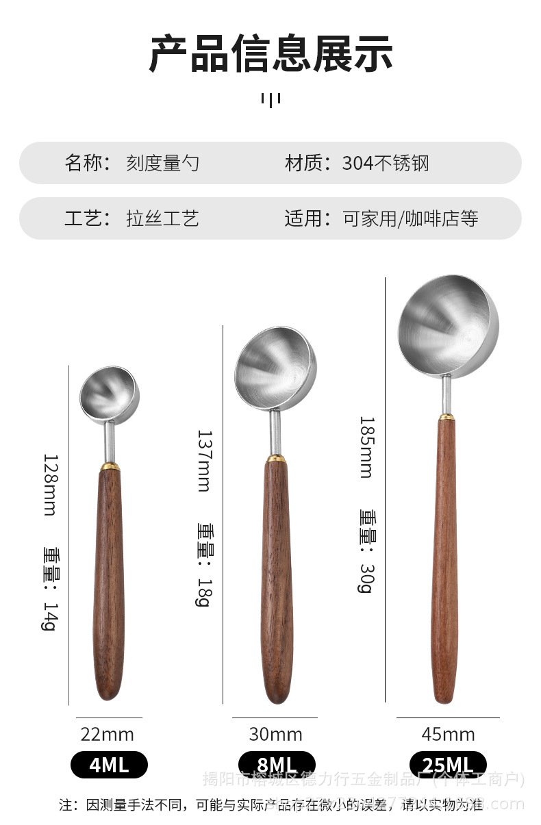 跨境304不锈钢咖啡豆量勺胡桃木柄食品刻度勺子果粉奶茶粉调味匙