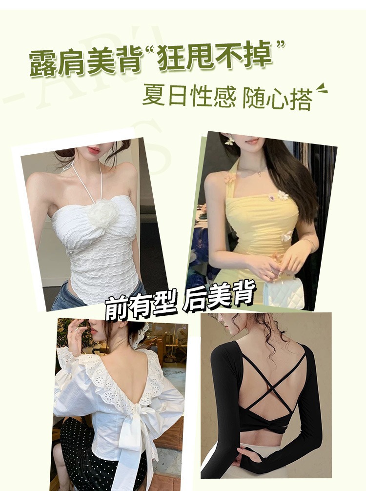 肩ひものない下着の女性は夏の薄いタイプの滑り止めのステルスを着て胸を拭きます。