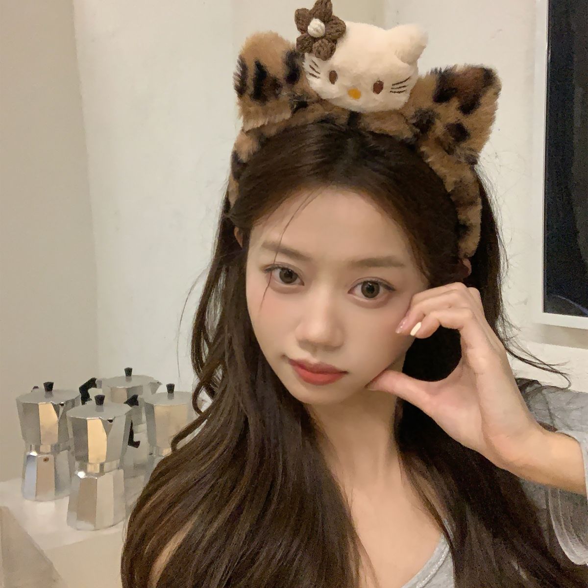 粉色豹纹Kitty蝴蝶结毛绒发箍女可爱百搭头箍洗脸发卡高颅顶头饰