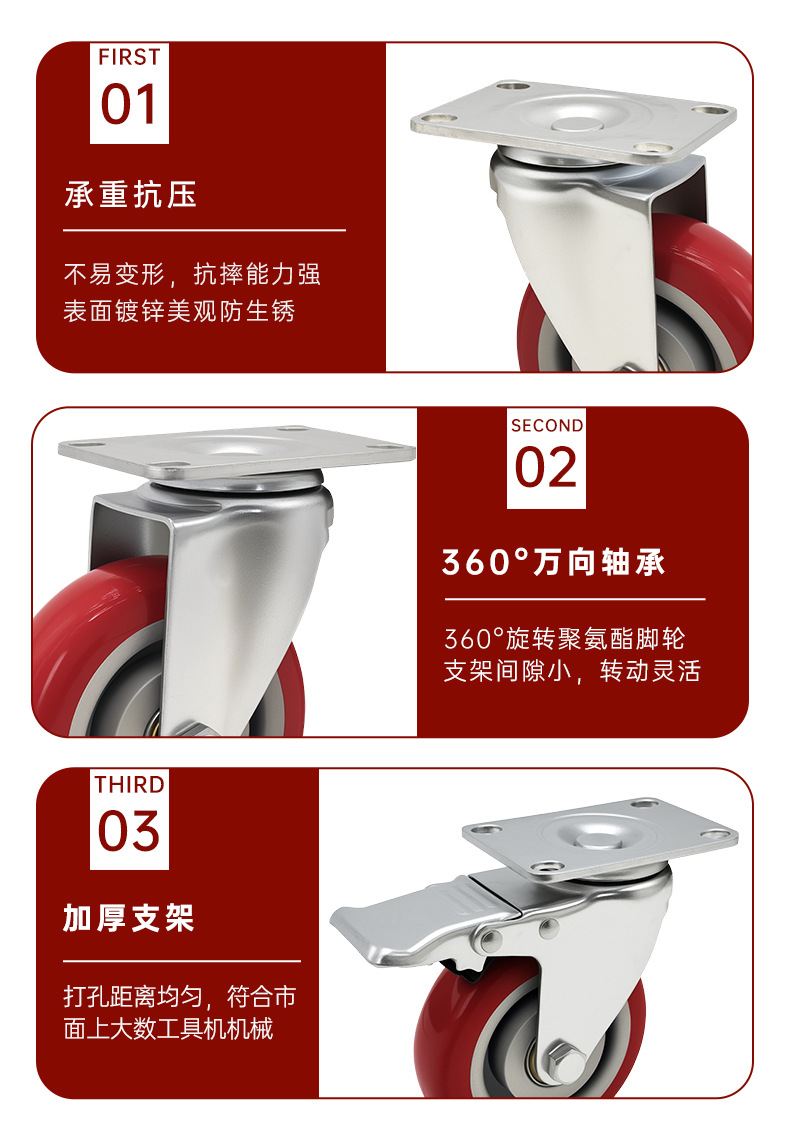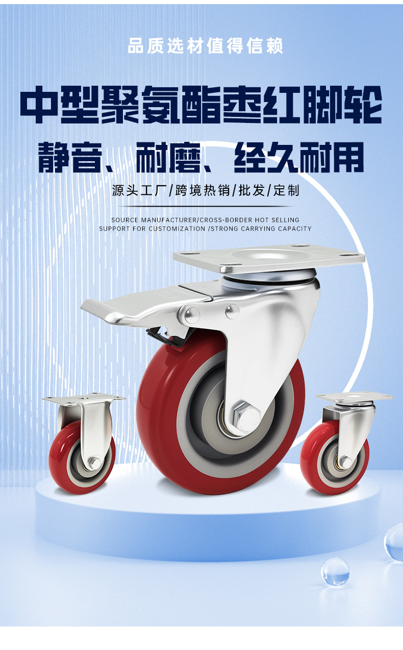 中型 PU ポリウレタンマルーンユニバーサルホイールキャスター ブレーキ付き 2.5 / 345inch 工業用キャビネットトロリーホイール