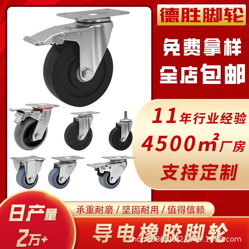 中型ゴム静音自在ブレーキ車輪345インチ炭素鋼ブラケット電子工場黒色導電輪方向キャスター