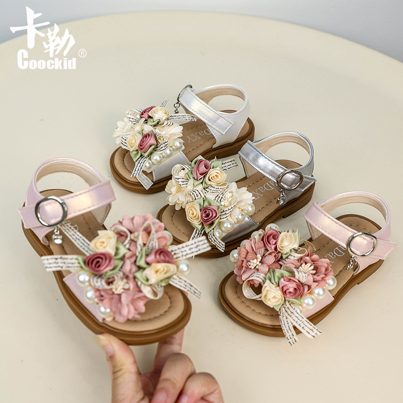 女の子サンダル妖精スタイルビーチシューズ夏の新パールフラワーサンダルノンスリップオープントゥ通気性プリンセスサンダル