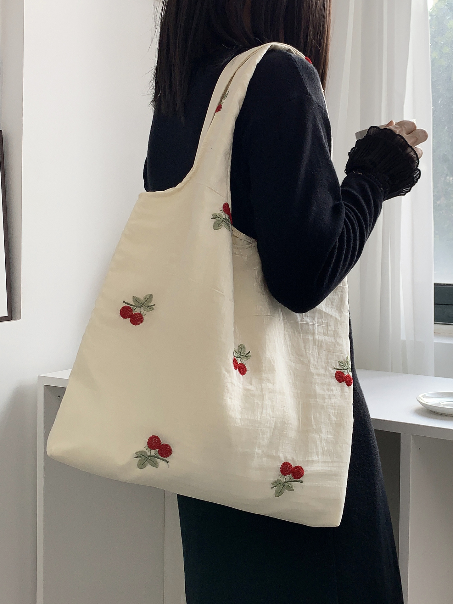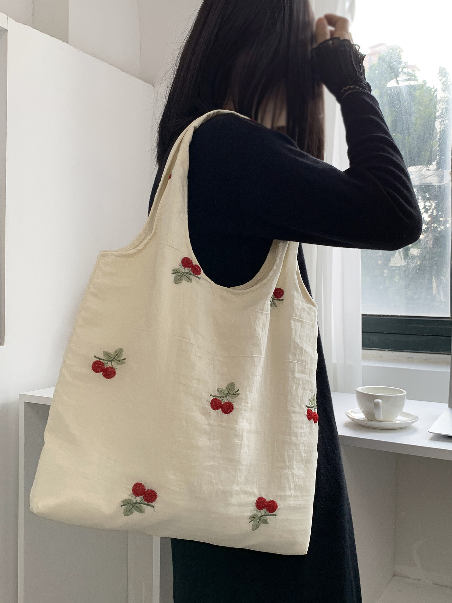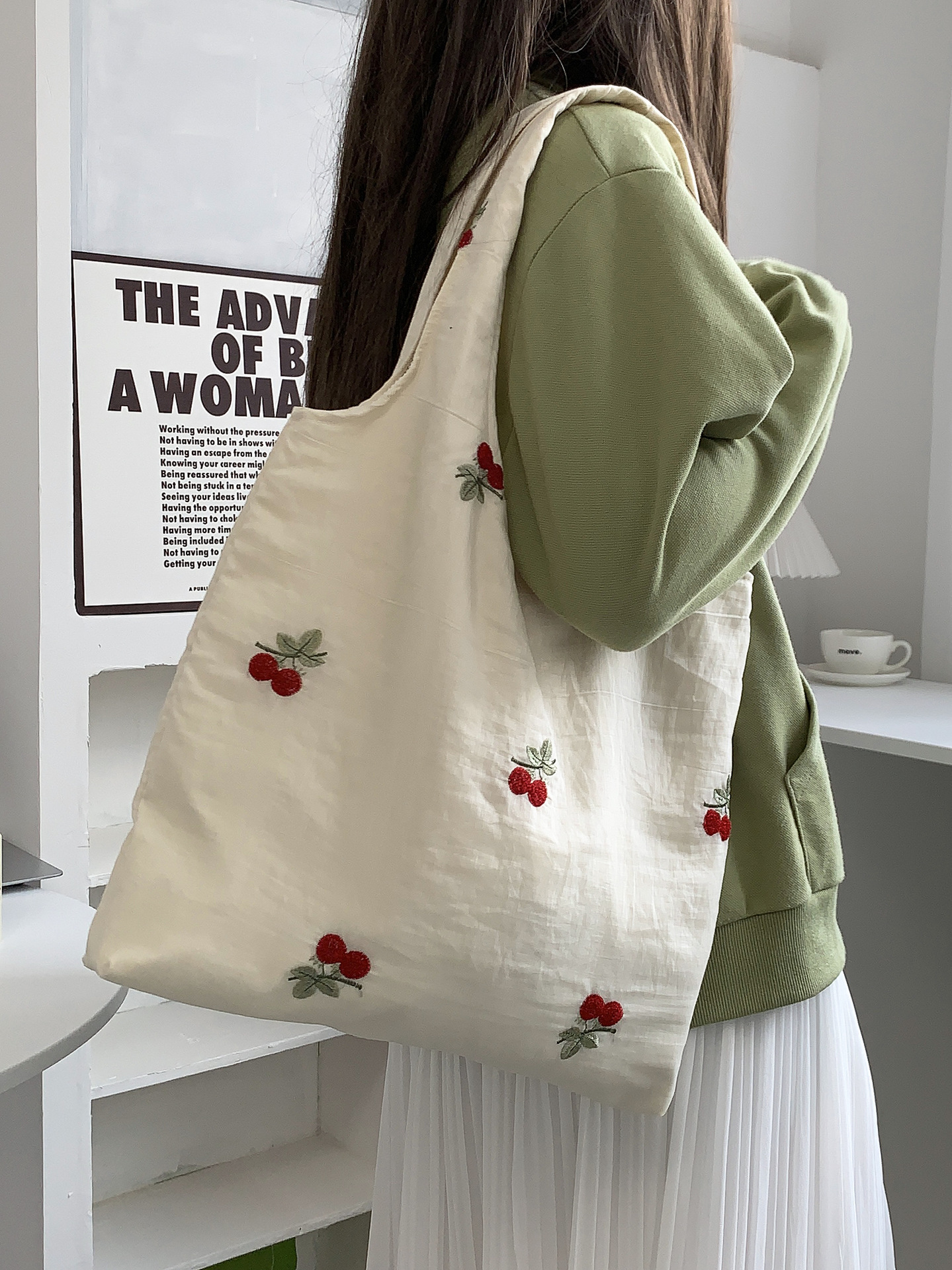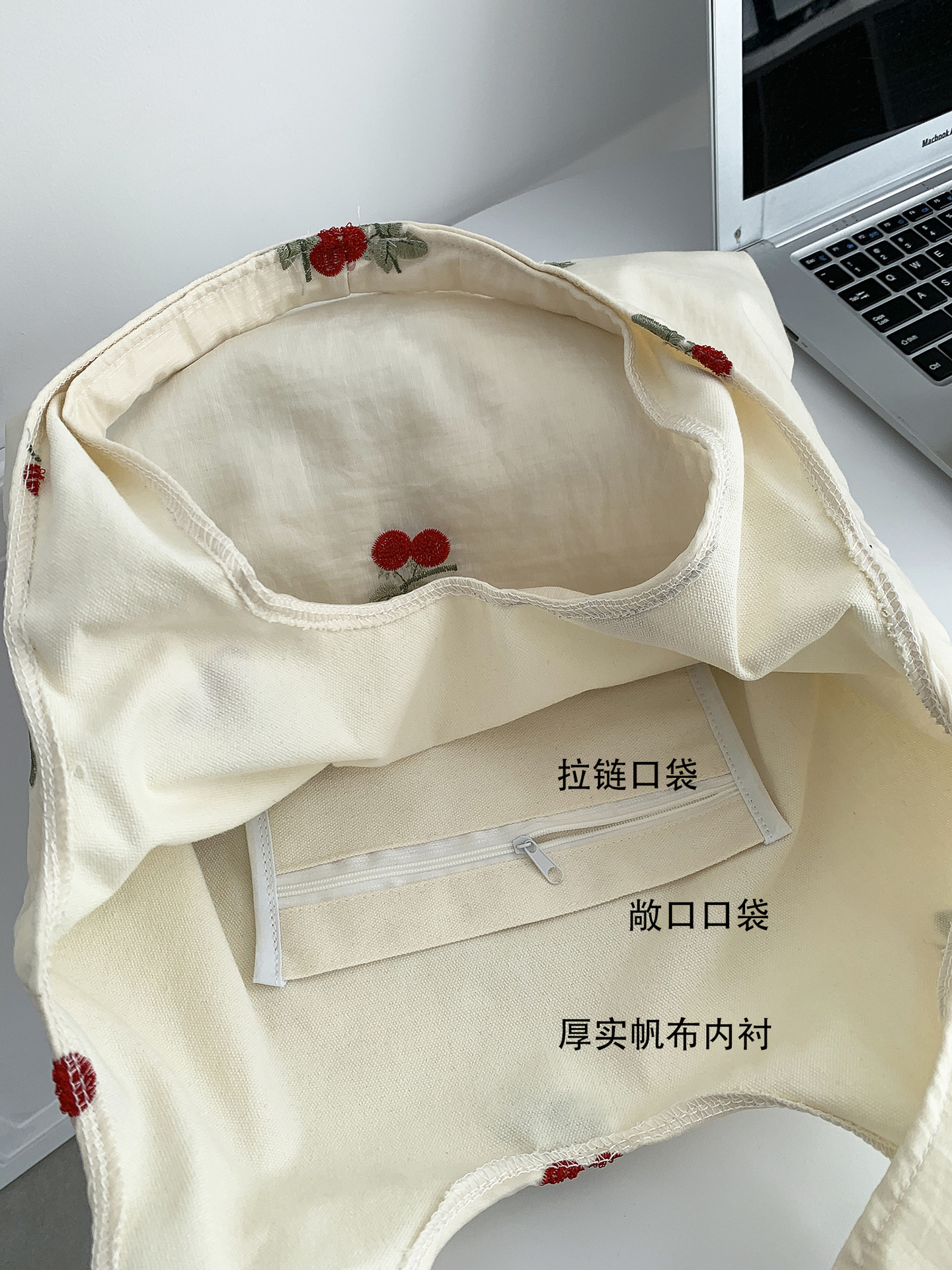 インチュール刺繍チェリー大容量学生ショルダーバッグ女性の脇の下バッグ通勤キャンバスバッグトートバッグ