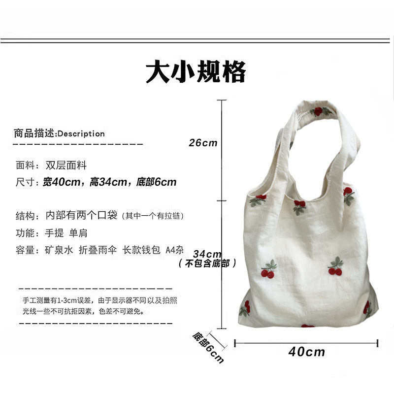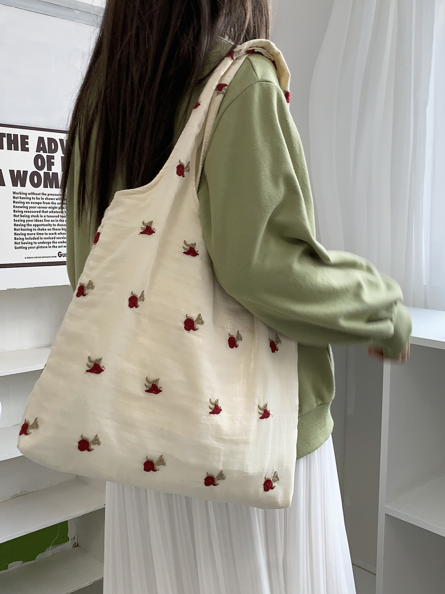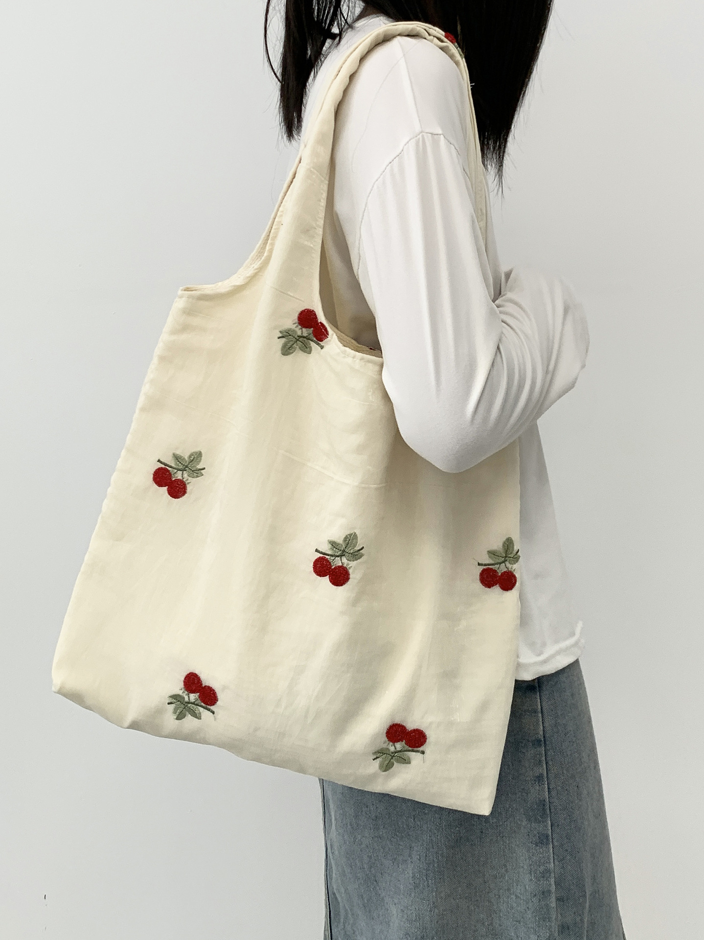 インチュール刺繍チェリー大容量学生ショルダーバッグ女性の脇の下バッグ通勤キャンバスバッグトートバッグ