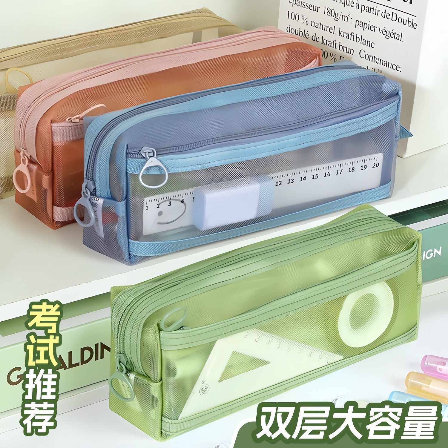 简约透明网纱笔袋双层便携考试笔袋ins日系学生大容量文具收纳袋