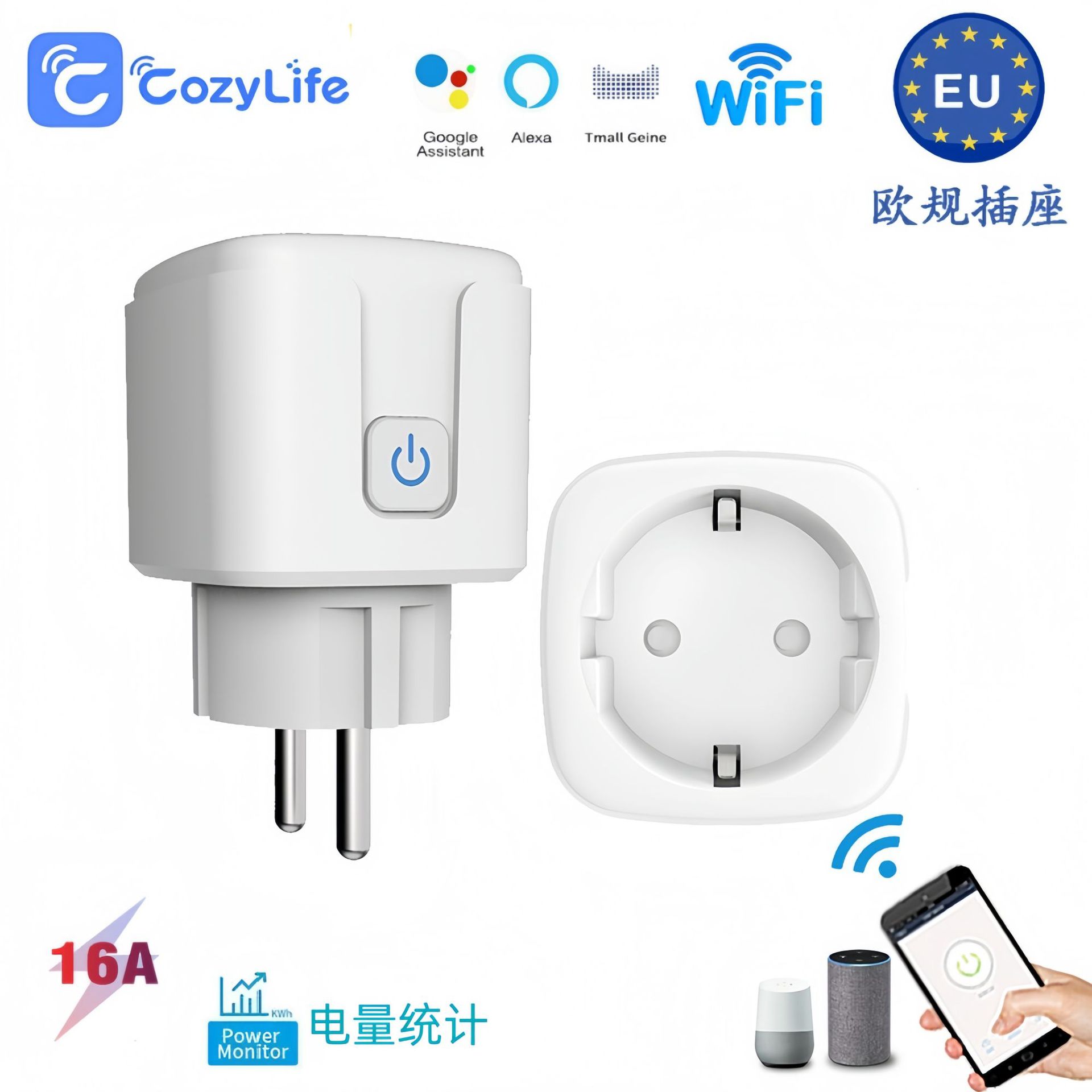 智能欧规插座WiFi插头带计量Cozylife APP手机远程定时语音控制