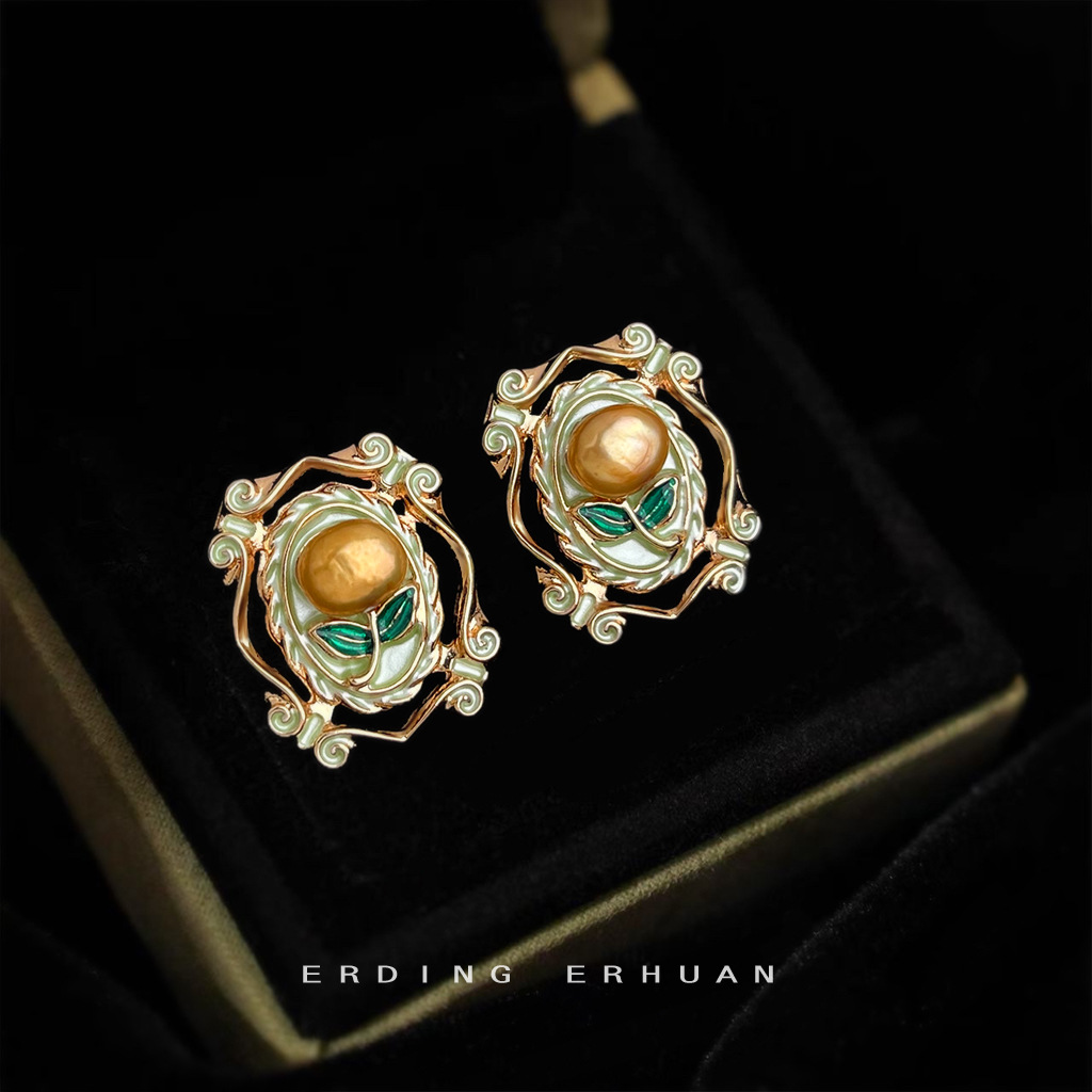 淡水珍珠法式复古彩绘油画质感中古风文艺925银针镀14K耳饰耳钉女