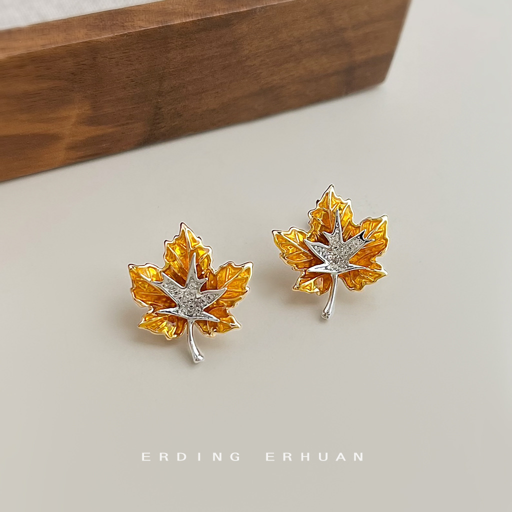 爆款!枫叶双拼色微镶锆石珐琅滴釉彩绘s925银针新款树叶耳饰耳钉