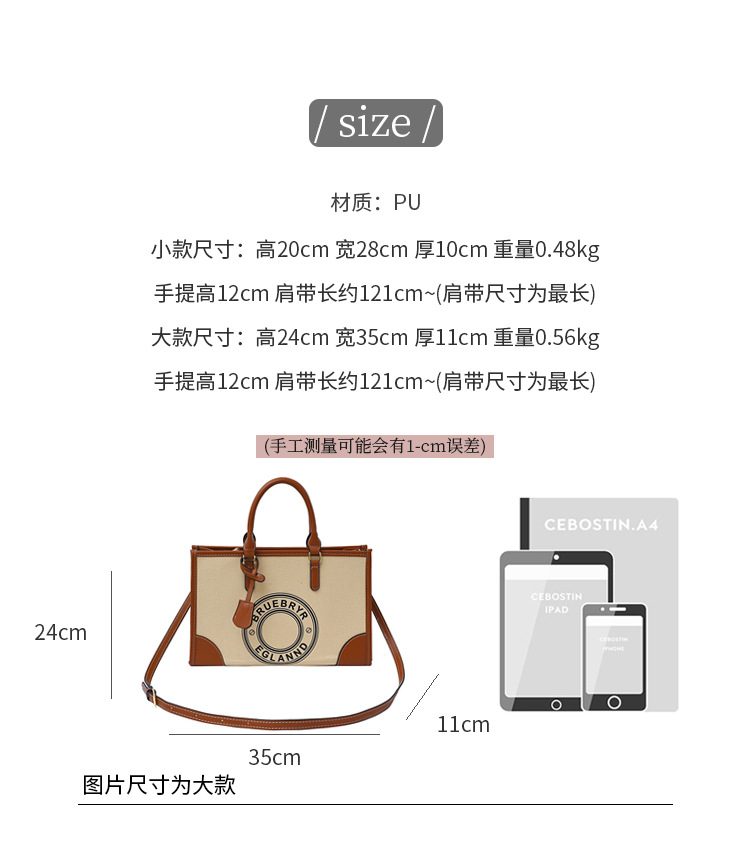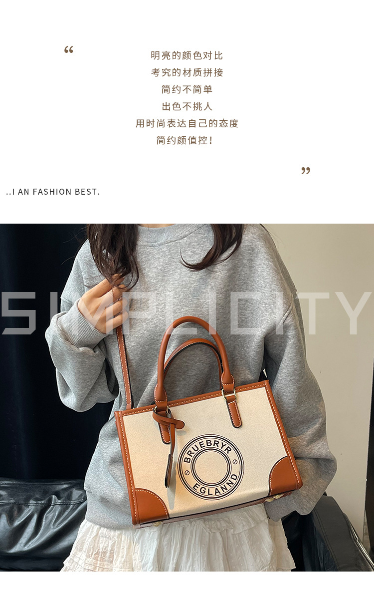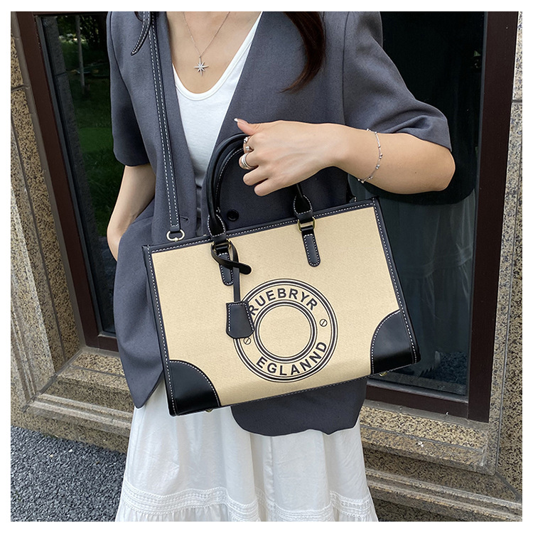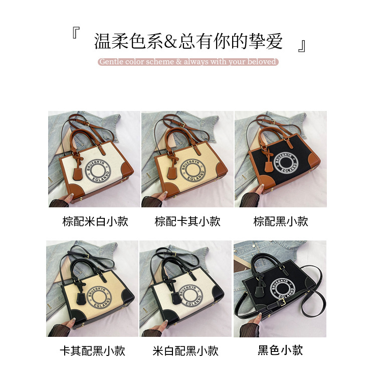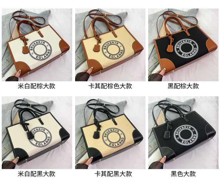 欧美复古单肩时尚帆布拼接撞色大容量印花字母2025新款手提托特包