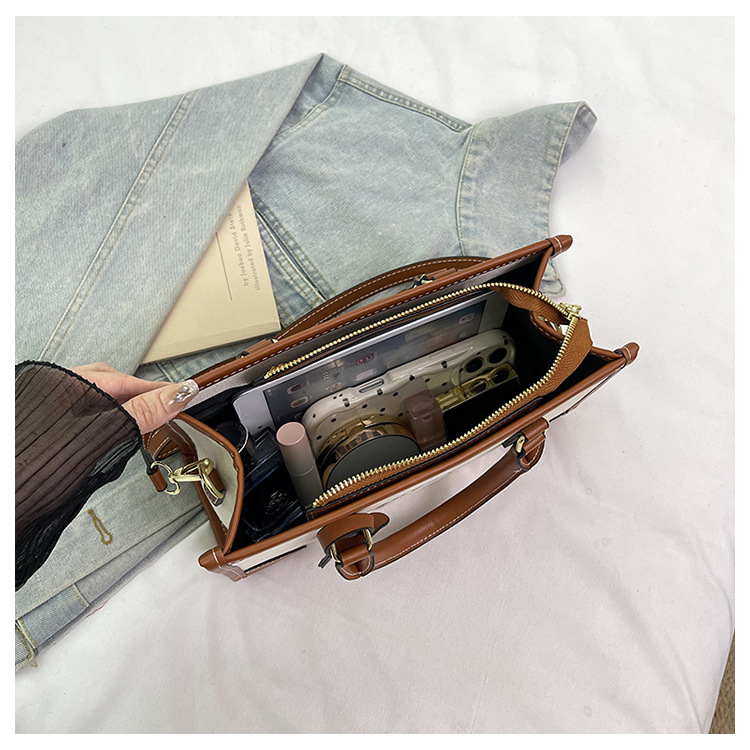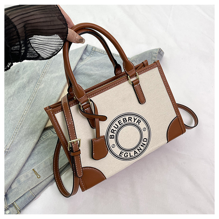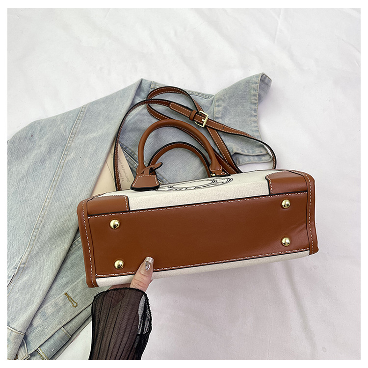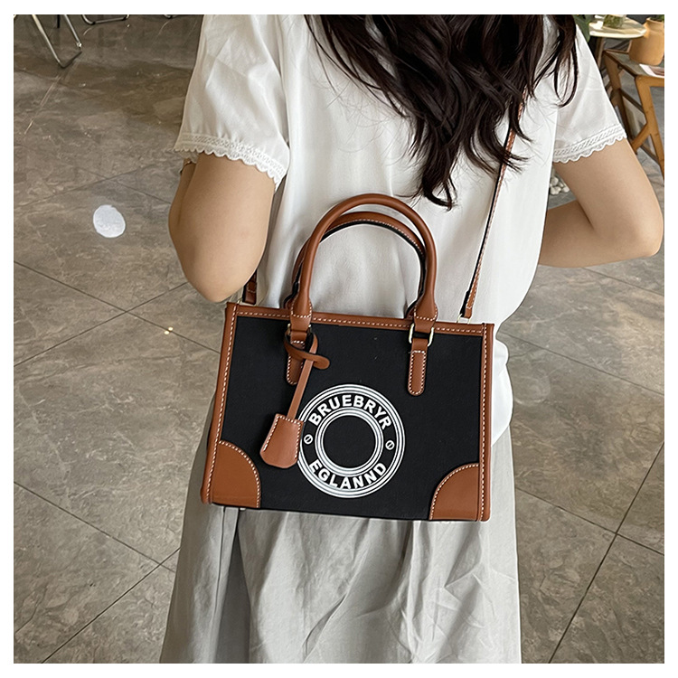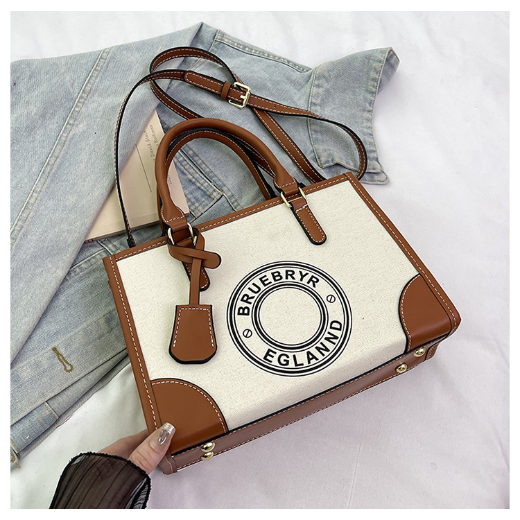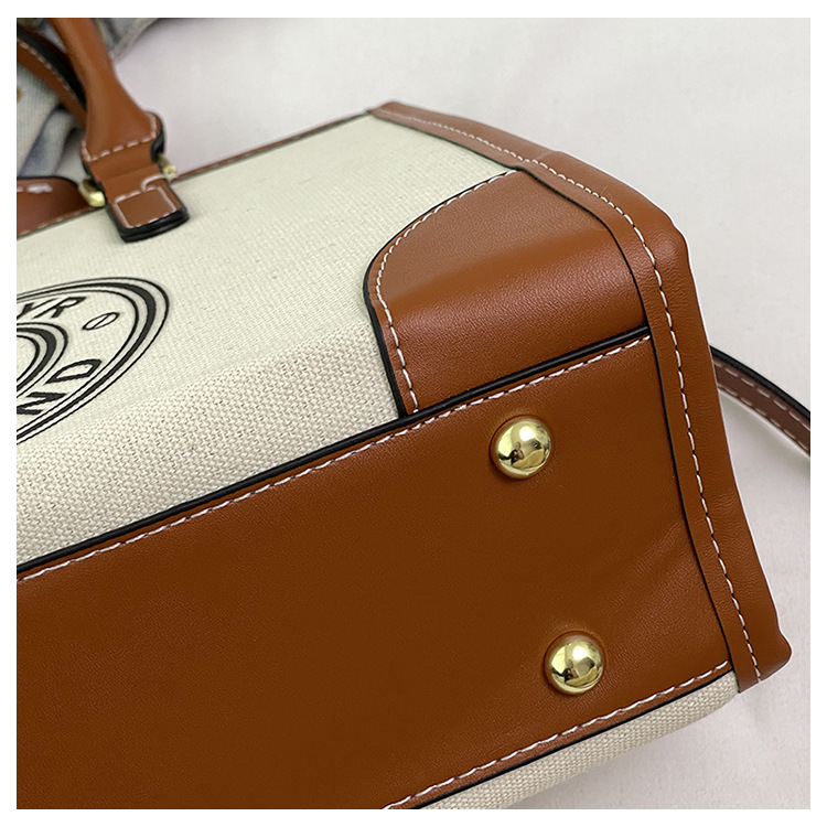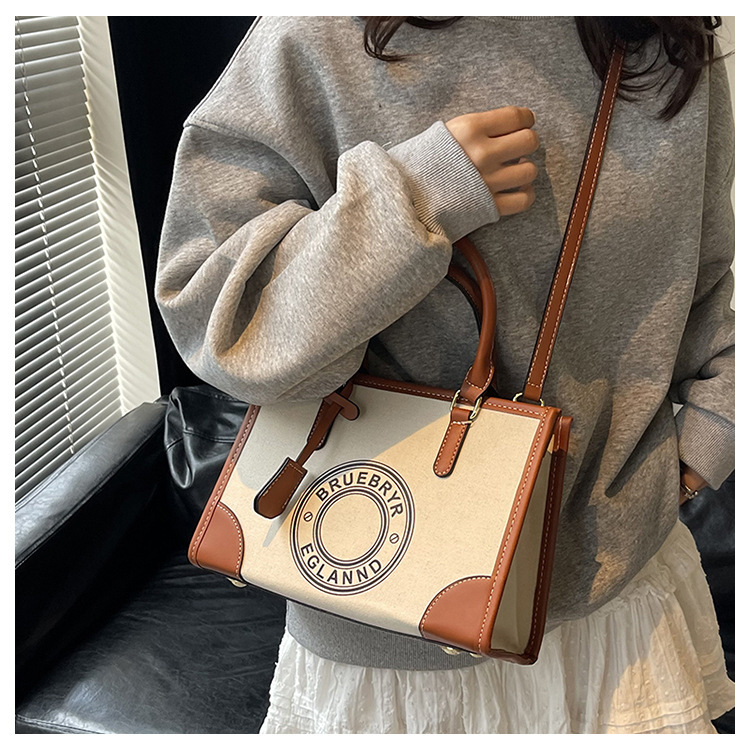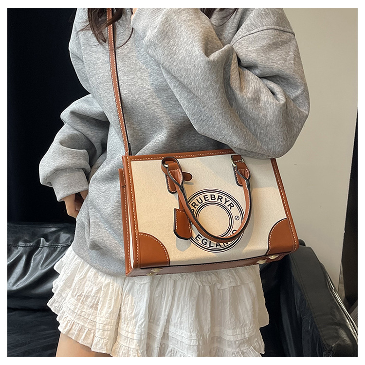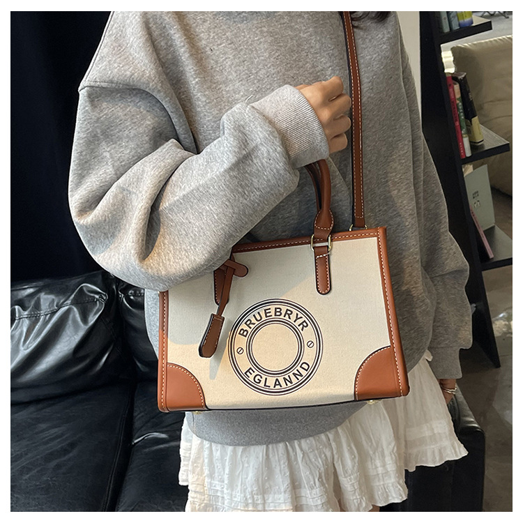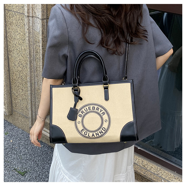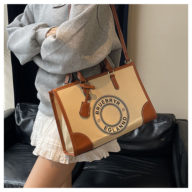 单肩时尚大容量印花字母帆布拼接撞色2025新款欧美复古手提托特包