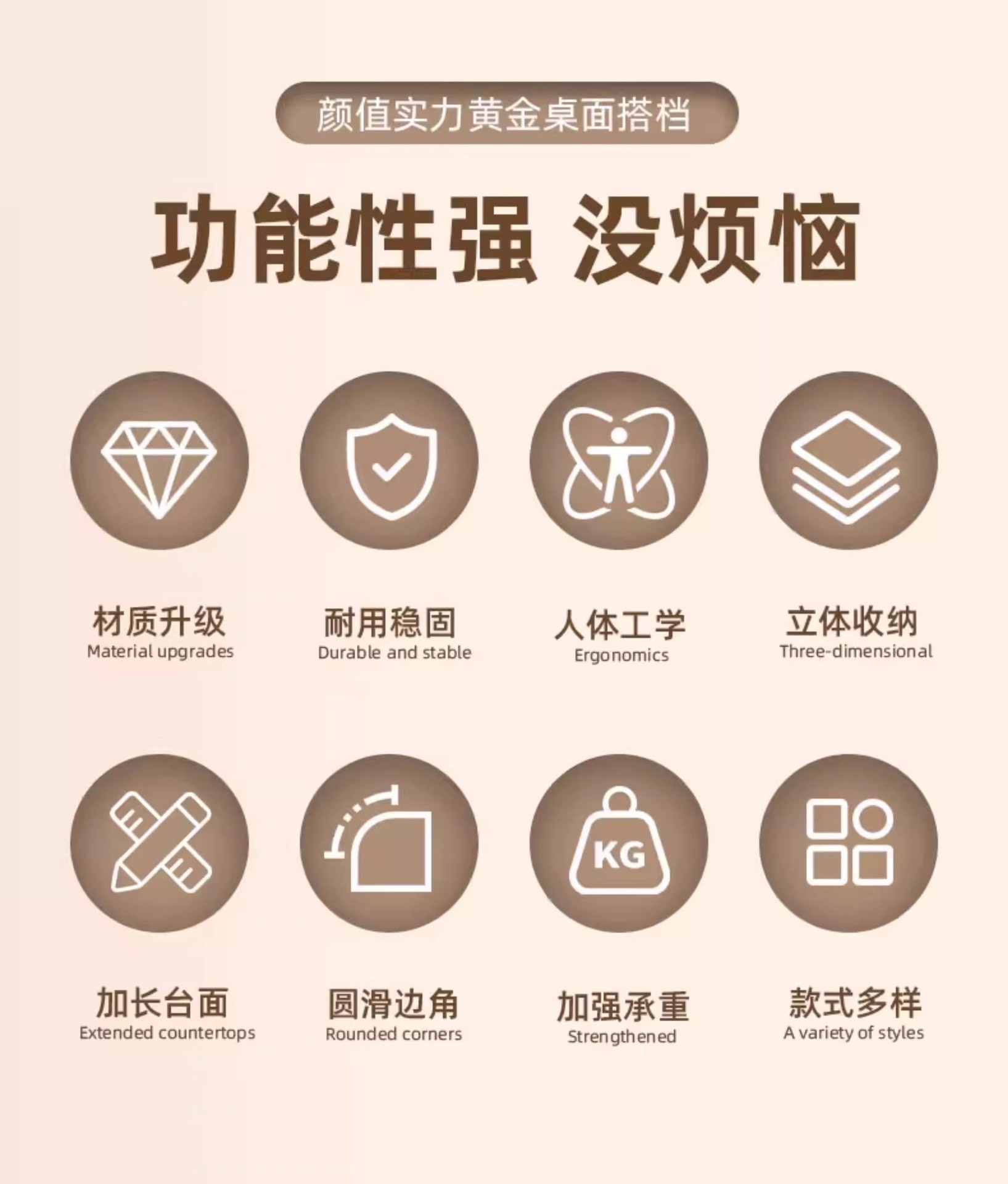 颜色 单层50*20*8白色,单层50*20*8黑色,单层50*20*8榉木色,双层增高架50*20*13白色,双层增高架50*20*13黑色,双层增高架50*20*13原木色,三层收纳柜暖白色,三层收纳柜黑色,三层收纳柜榉木色,单层+三层收纳柜白色,单层+三层收纳柜黑色,单层+三层收纳柜榉木色,双层+三层收纳柜白色,双层+三层收纳柜黑色,双层+三层收纳柜原木色
