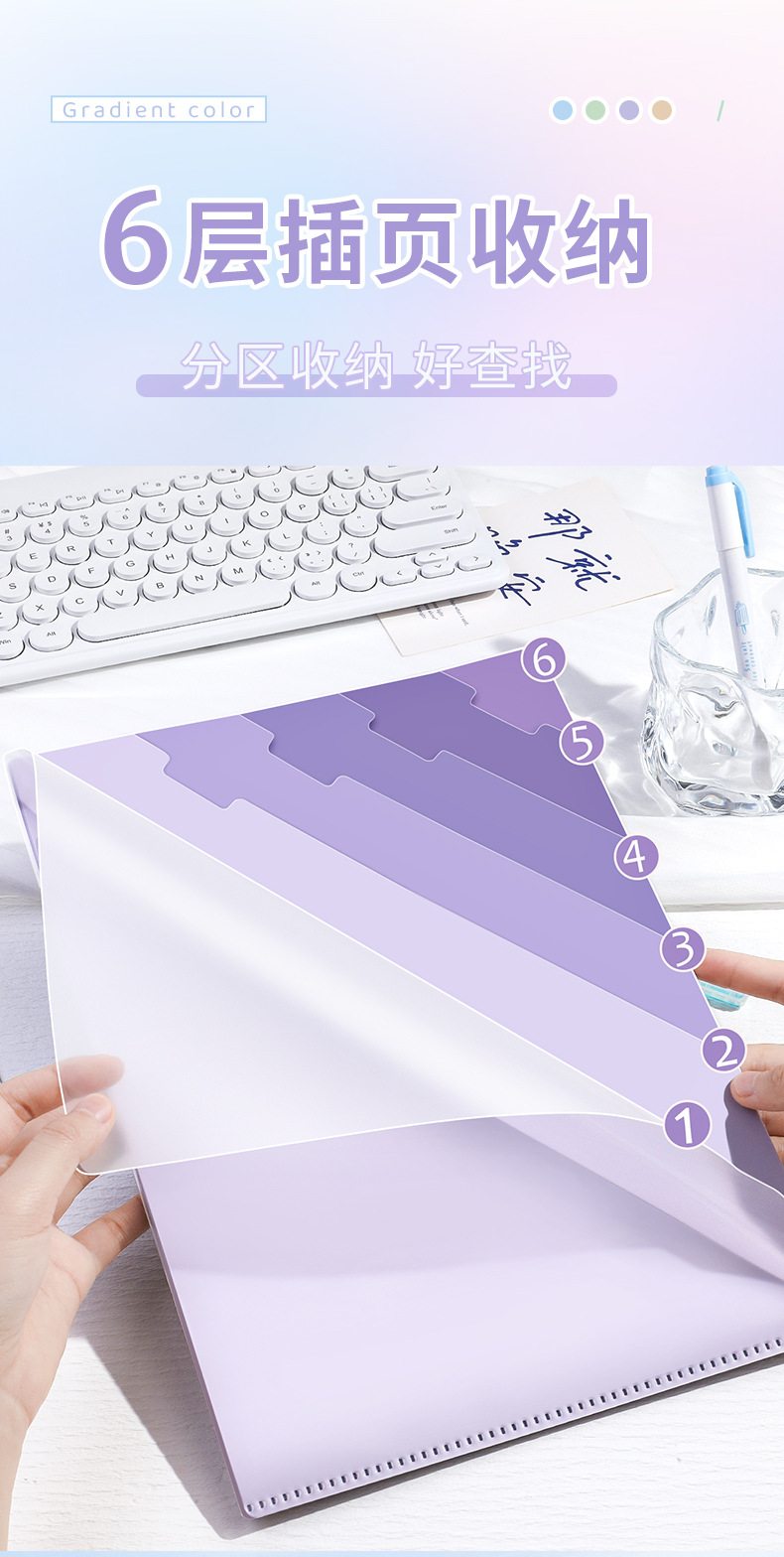 グラデーションカラーのL字型大開き試験用紙を備えた6コンパートメントのA4フォルダー、高価値、厚みのある大容量のデータストレージ