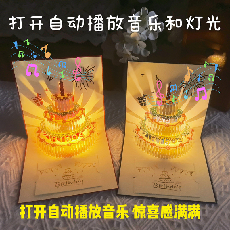 音楽とライト 3D 立体誕生日ケーキ グリーティングカード 祝福カード ハイエンド ハッピーバースデー ギフト封筒カード