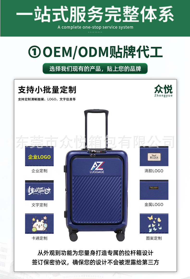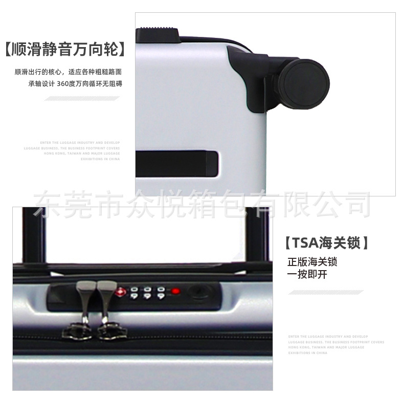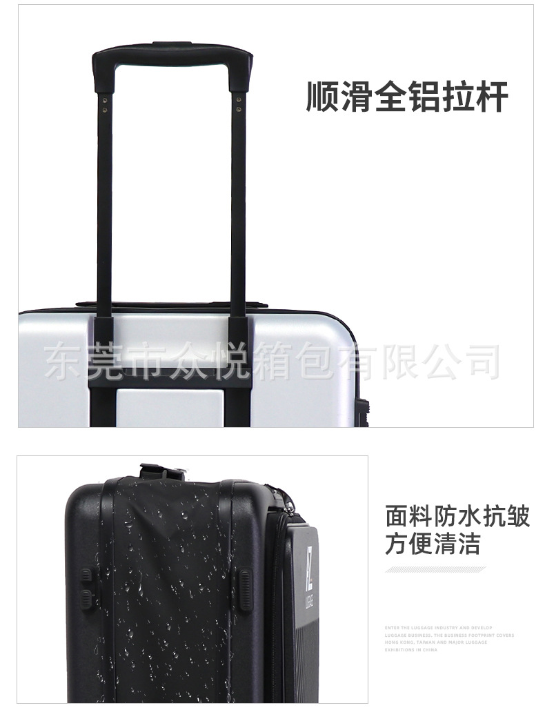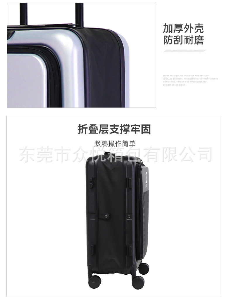 カスタマイズ可能なスーツケース、フロントオープン式、24inchインチ旅行用スーツケース、ワイドローラー、静音ユニバーサルホイール、OEMロゴ対応、パスワードロック付き