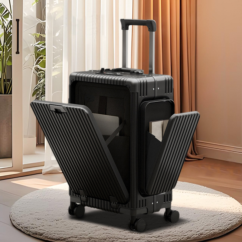 前置开口充电行李箱24寸铝框三开式双侧袋多功能旅行拉杆登机箱