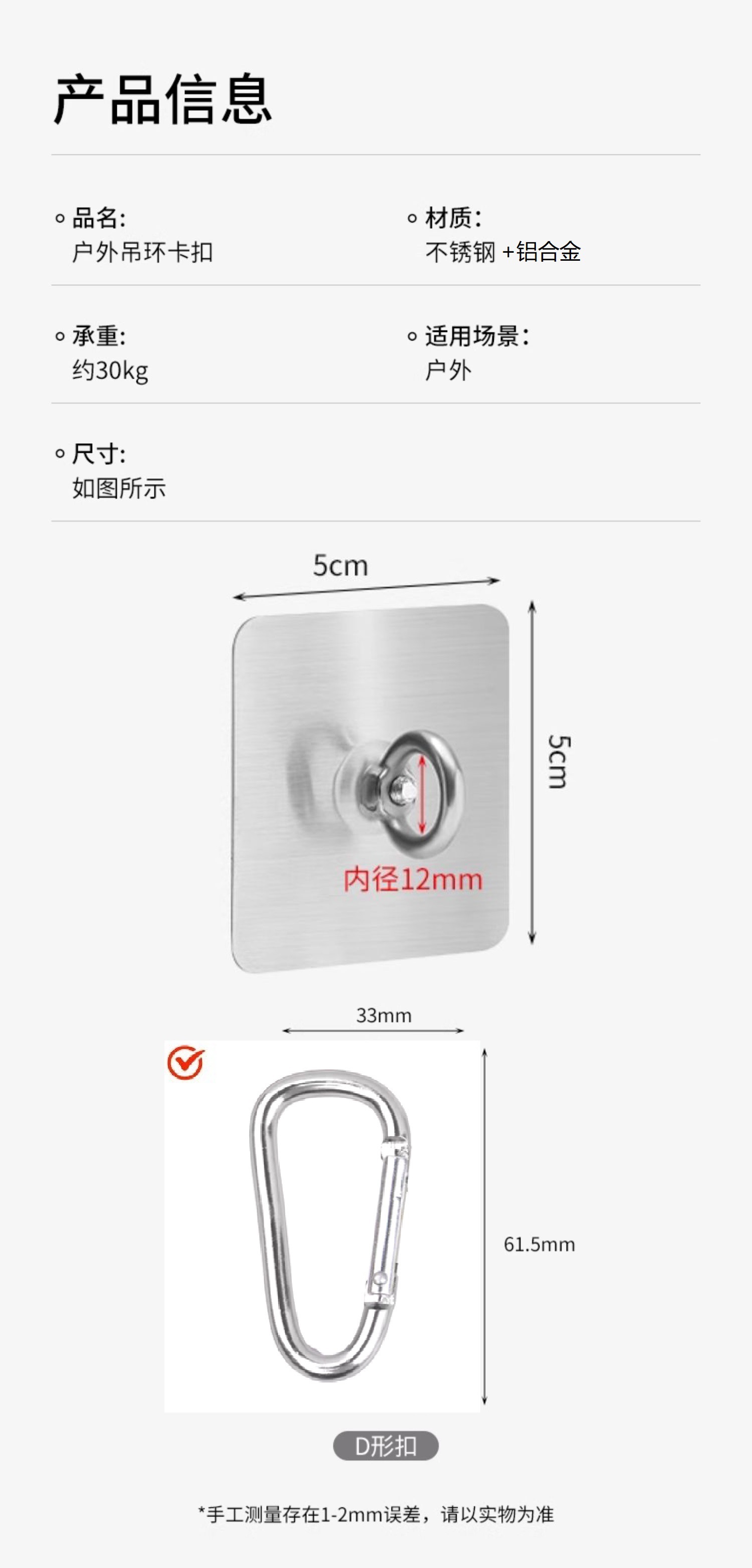 免打孔304不锈钢吊环挂钩无痕强力螺丝贴环形挂钩带D扣天花板固定