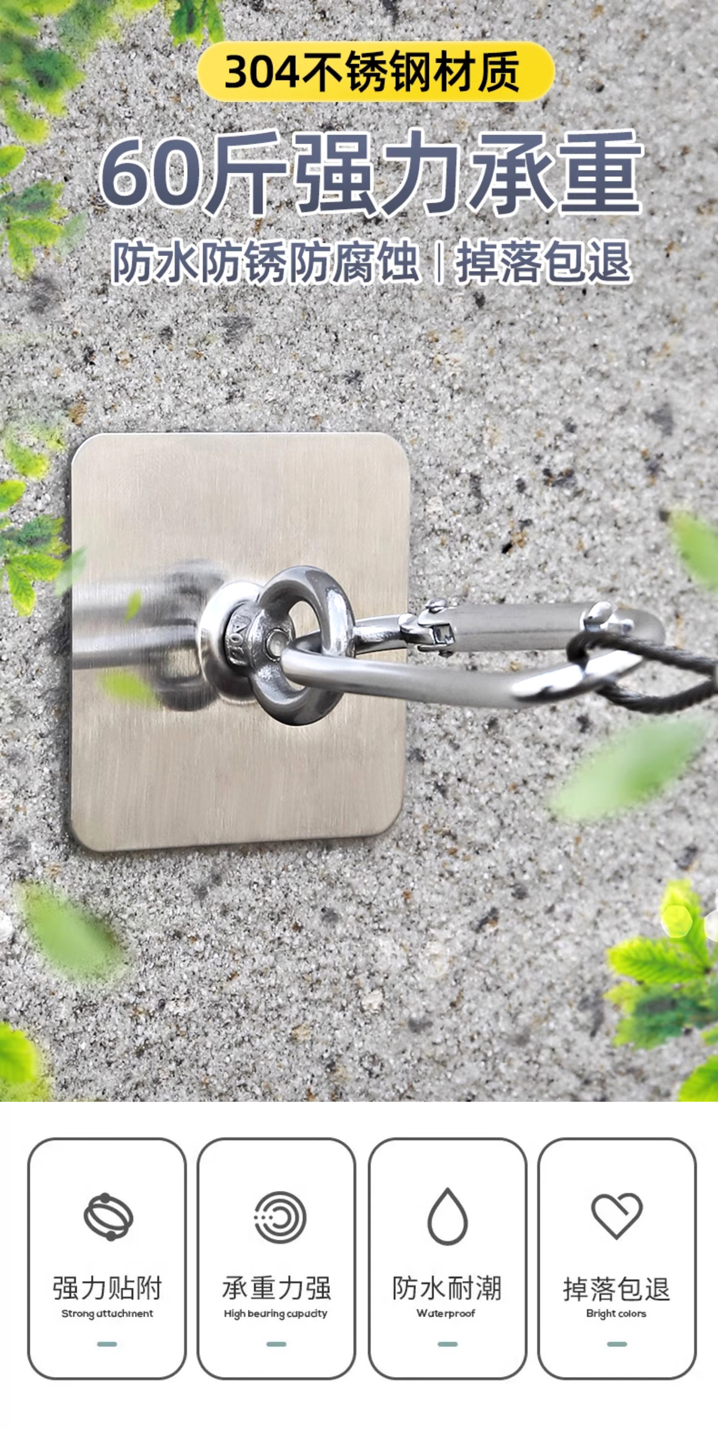 屋外セメント壁用フックフック、パンチフリー固定具、物干しロープ、強力な耐荷重ステンレス鋼リング粘着フック