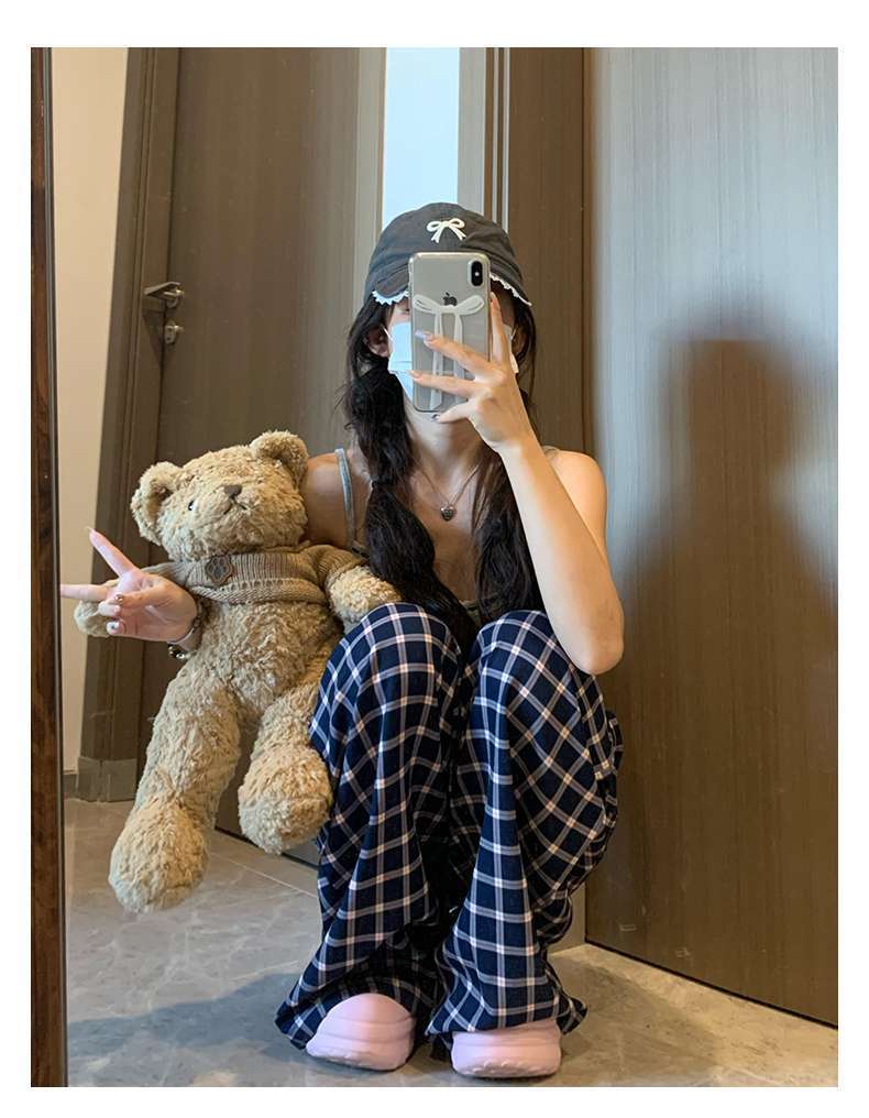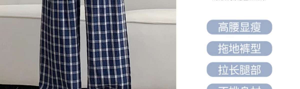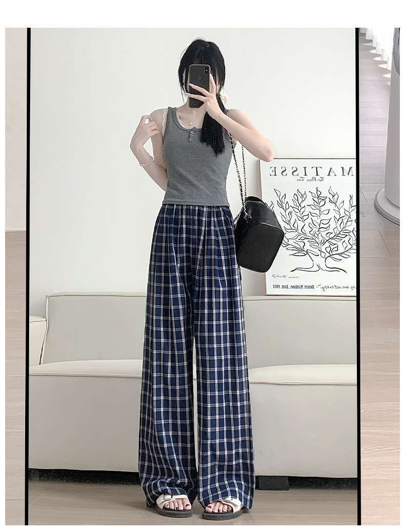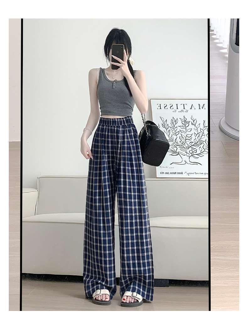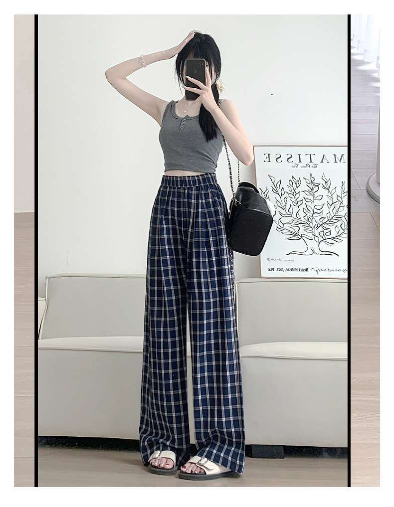 Zhao Lusiと同じスタイルの女性用チェック柄パンツ2024年夏新作ドレープレイジーレトロワイドレッグパンツポケット付き