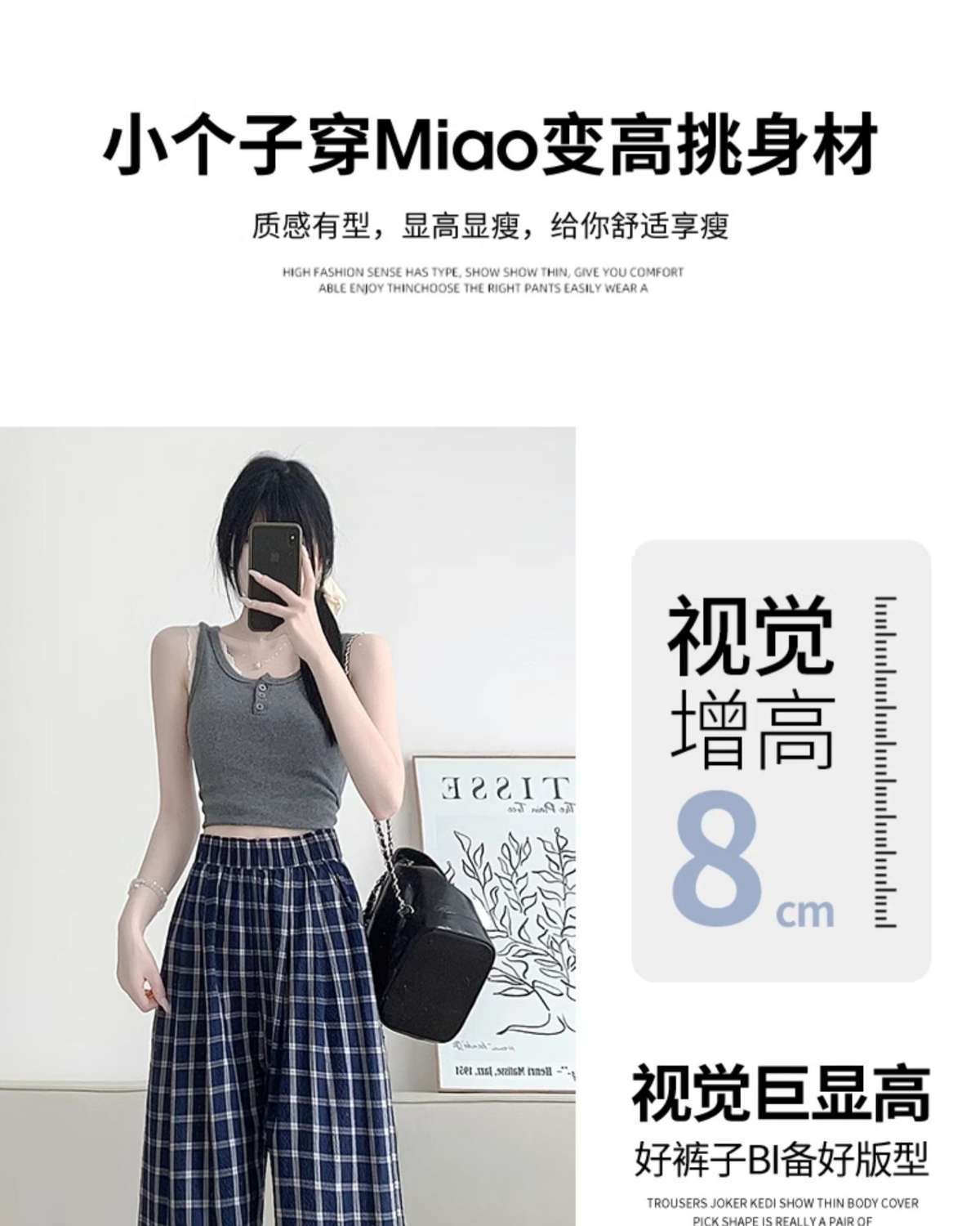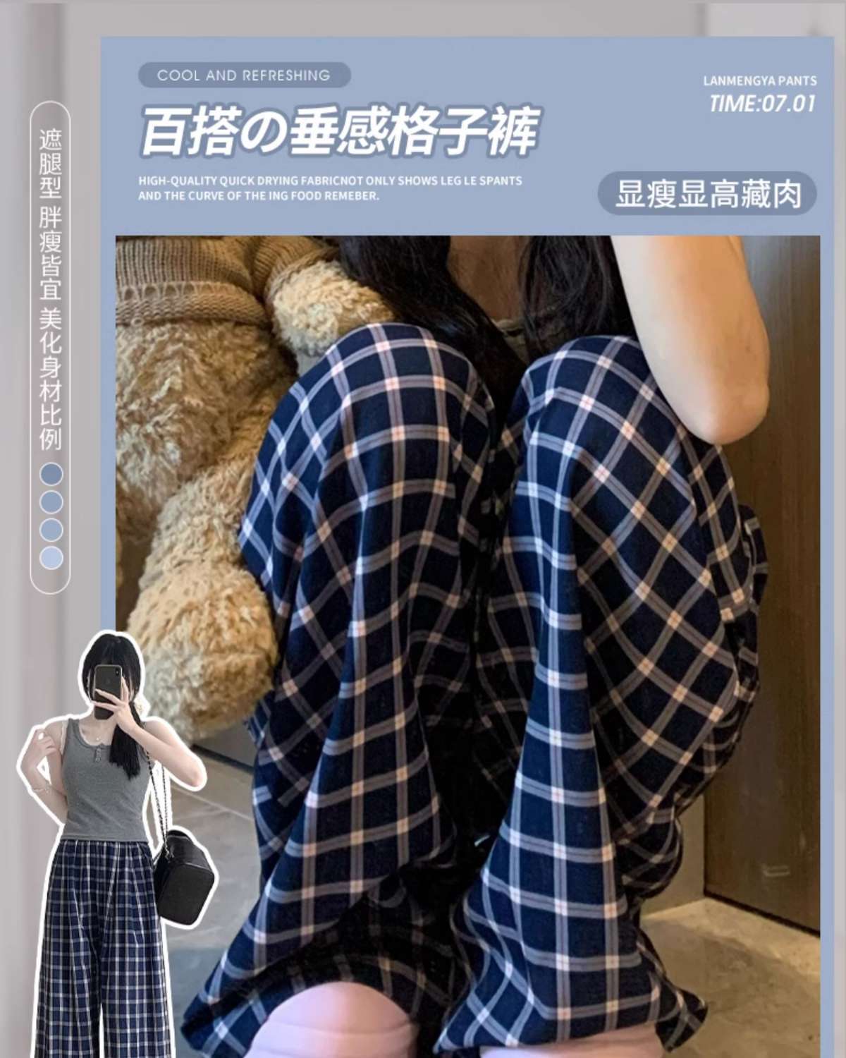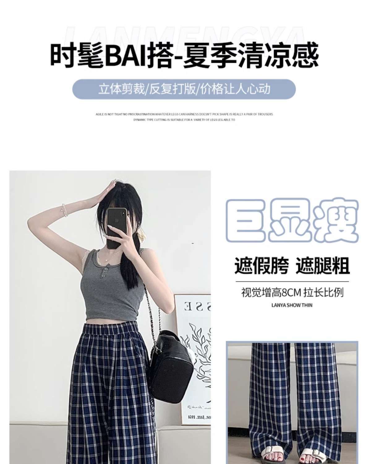 Zhao Lusiと同じスタイルの女性用チェック柄パンツ2024年夏新作ドレープレイジーレトロワイドレッグパンツポケット付き