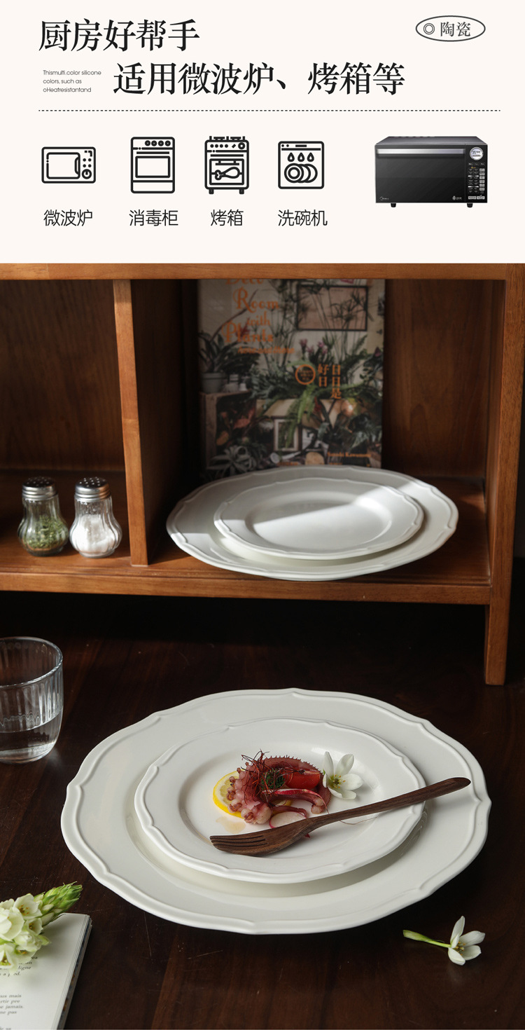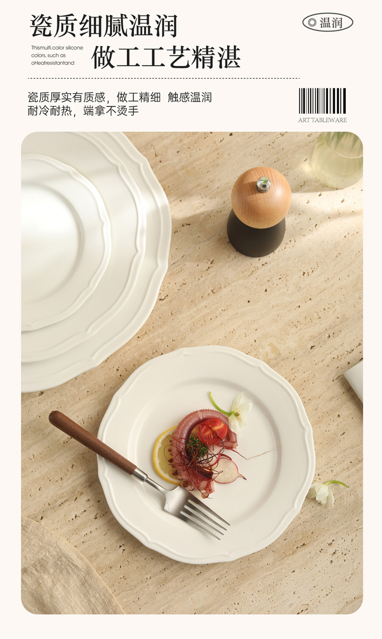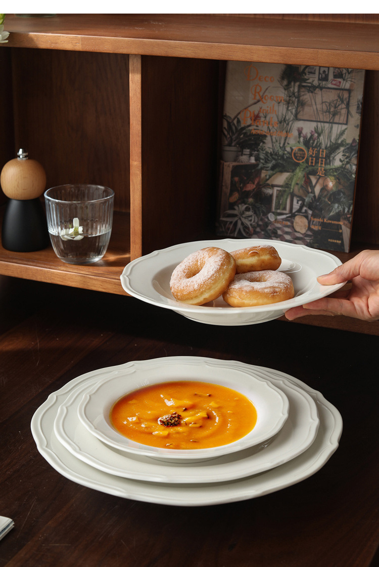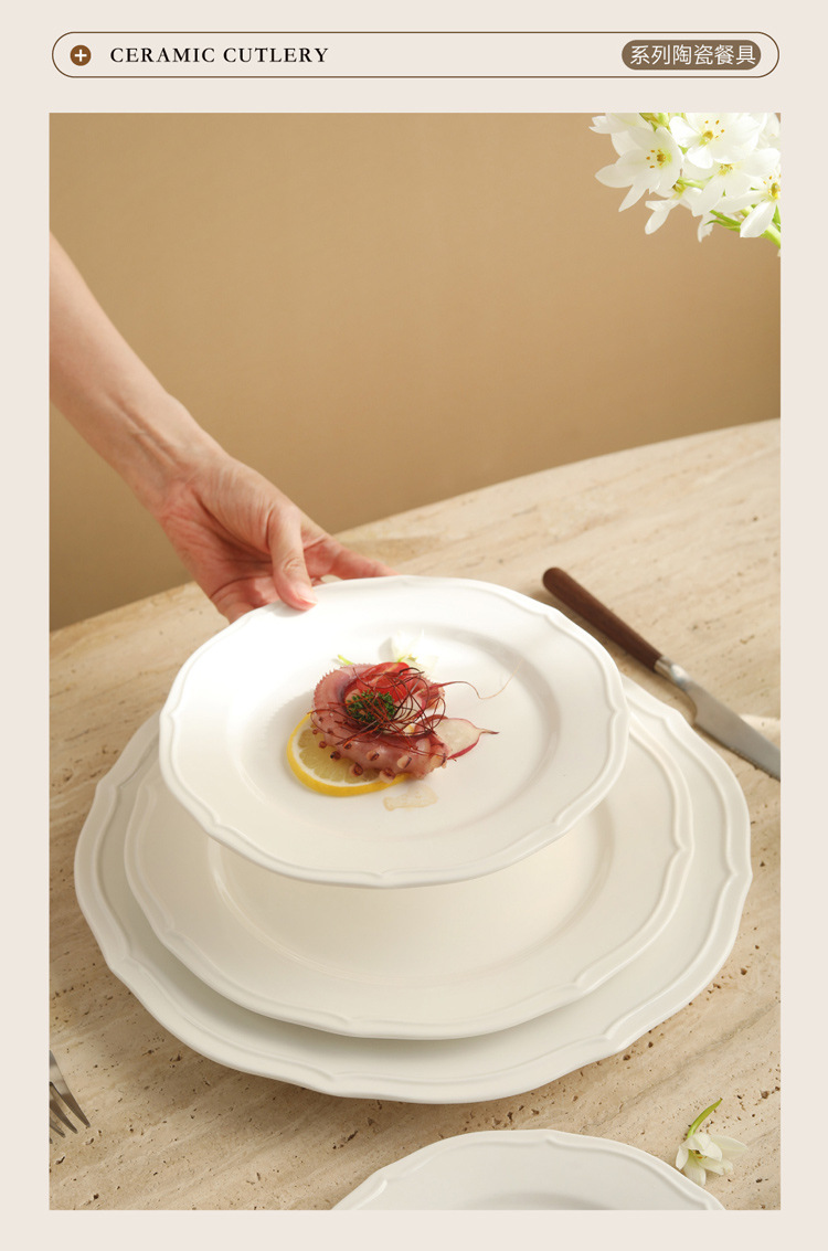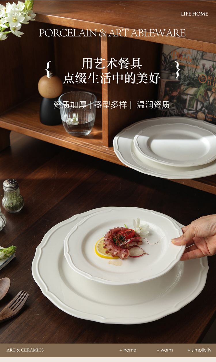 インススタイルレトロレリーフラインレースプレート純白セラミックプレートフレンチレリーフエッジ洋食プレートデザート朝食プレート