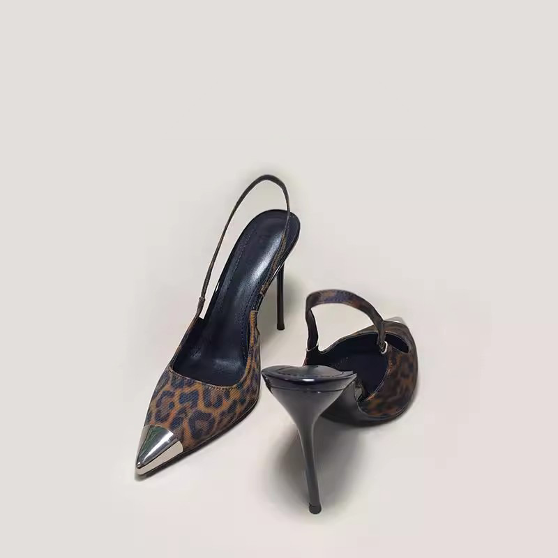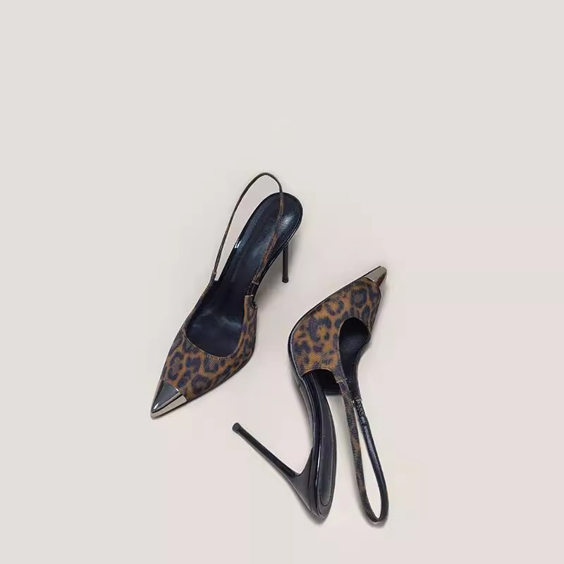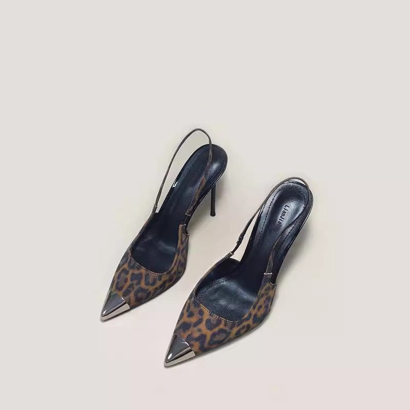 ヒョウ柄セクシーランジェリー〜ポインテッドトゥメタルトゥスティレットトゥサンダルレディース浅口ハイヒールレディース2025新スタイル