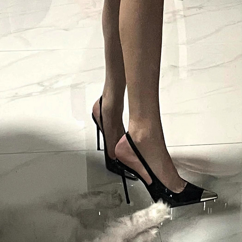 2025年夏新作ポインテッドトゥハイヒール、スティレットヒールハーフスリッパ、レディースパテントレザーブラック万能シンプルサンダル