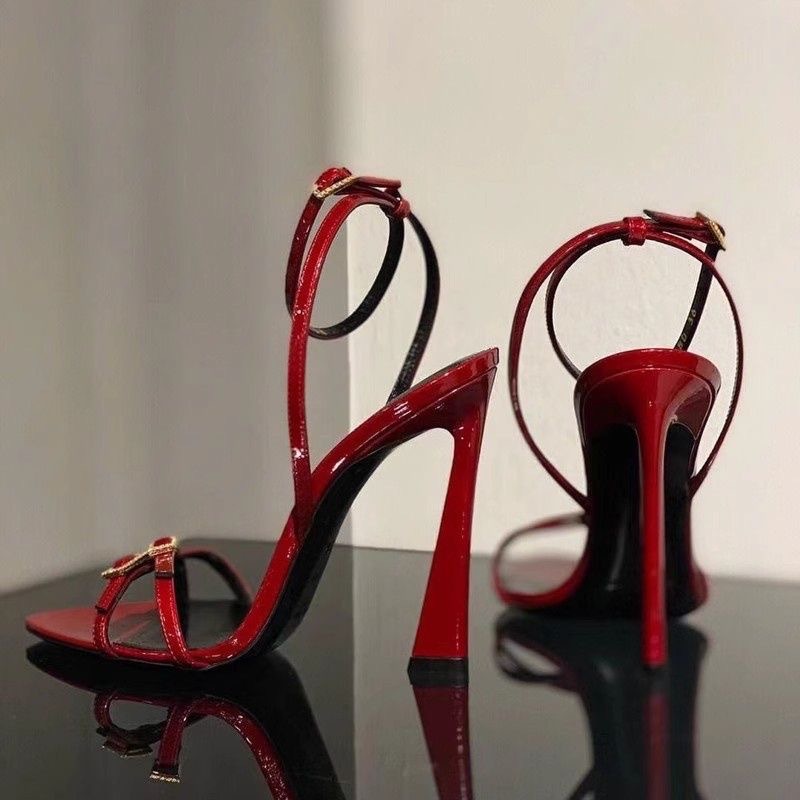 2025春の新型漆皮リベットの靴の横の細い靴と気質の裸のハイヒールは男の大衆の設計感を切ります。