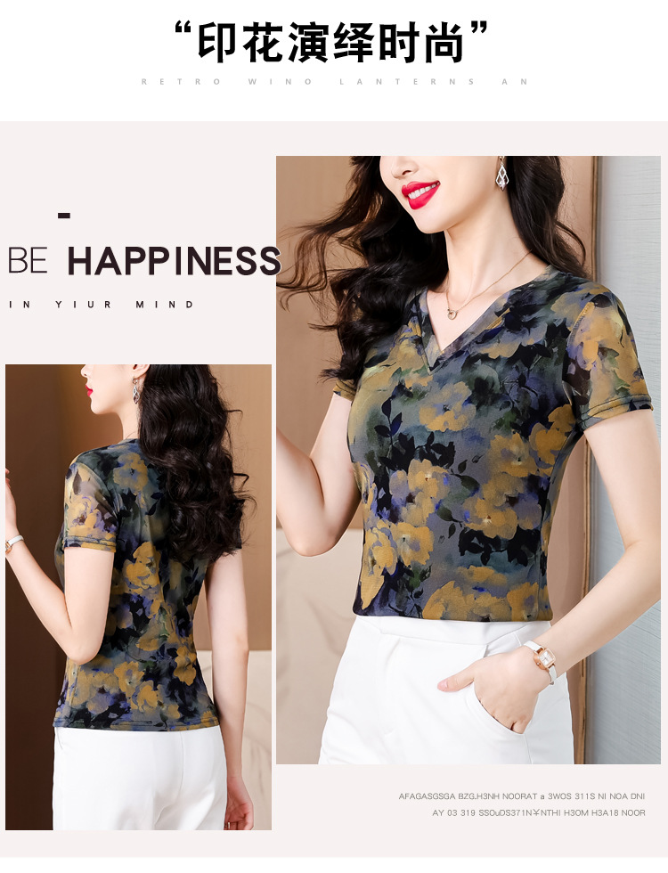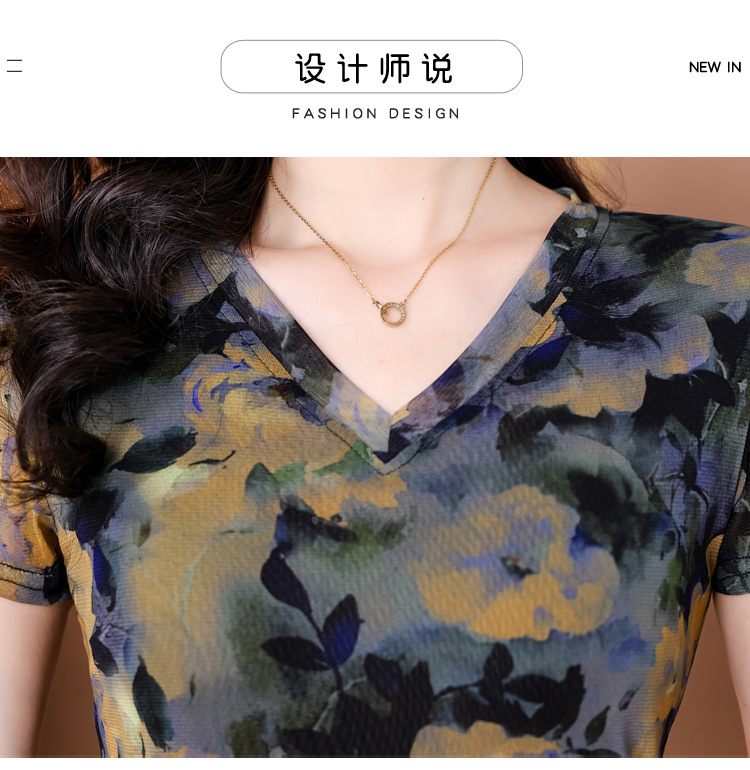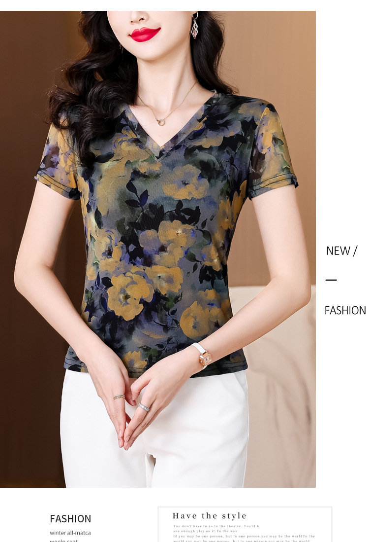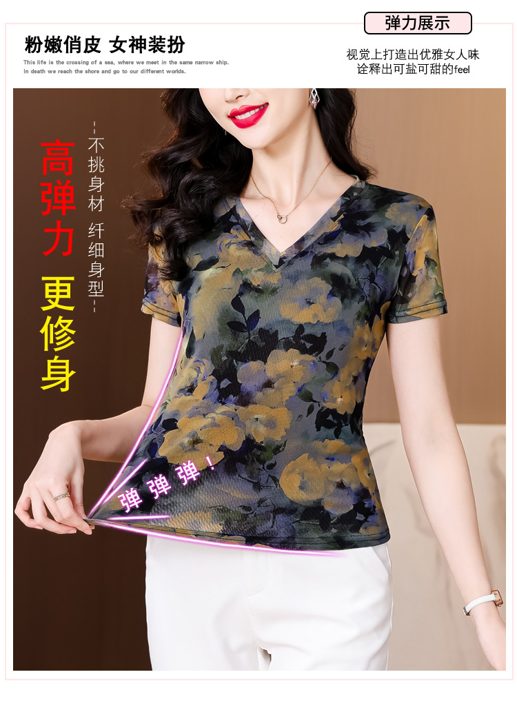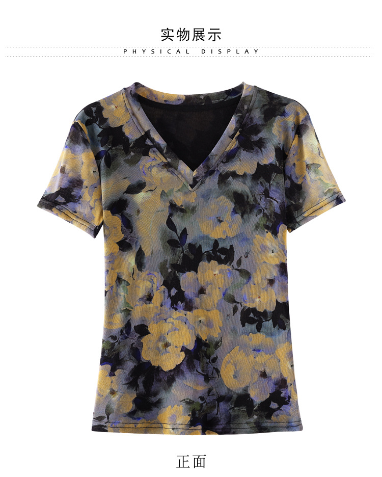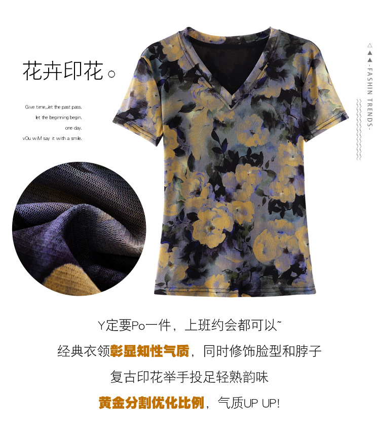 レトロパープルメッシュTシャツレディース半袖夏新作Vネック花柄シャツスリムでスタイリッシュな年齢軽減レディーストップス