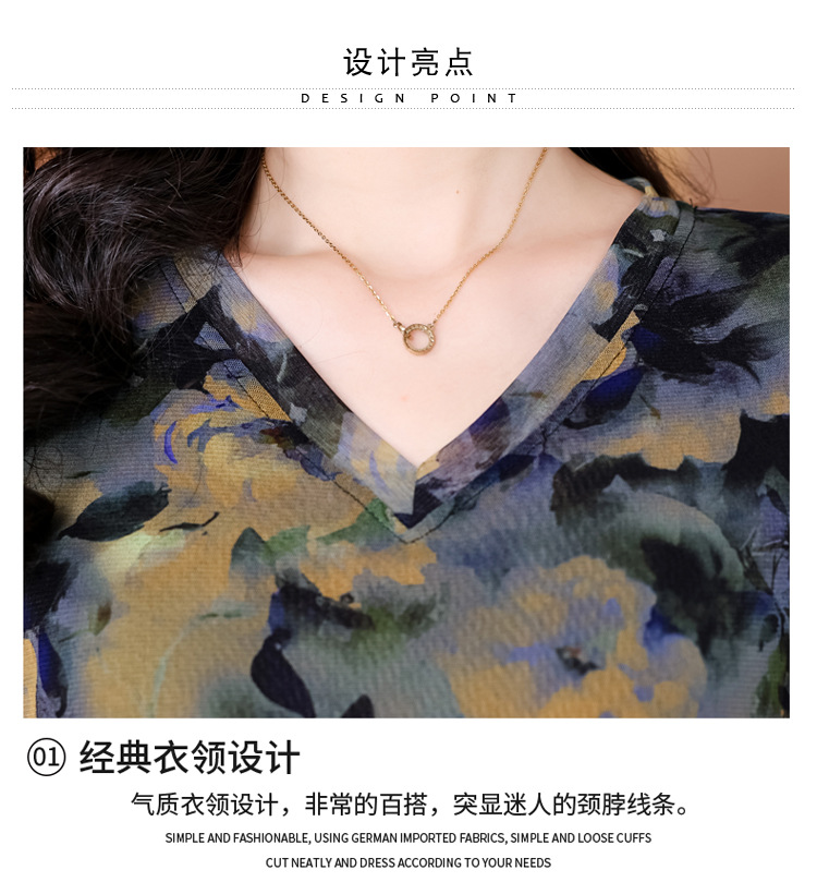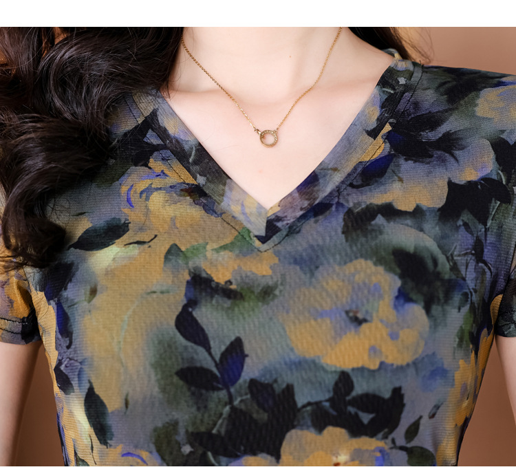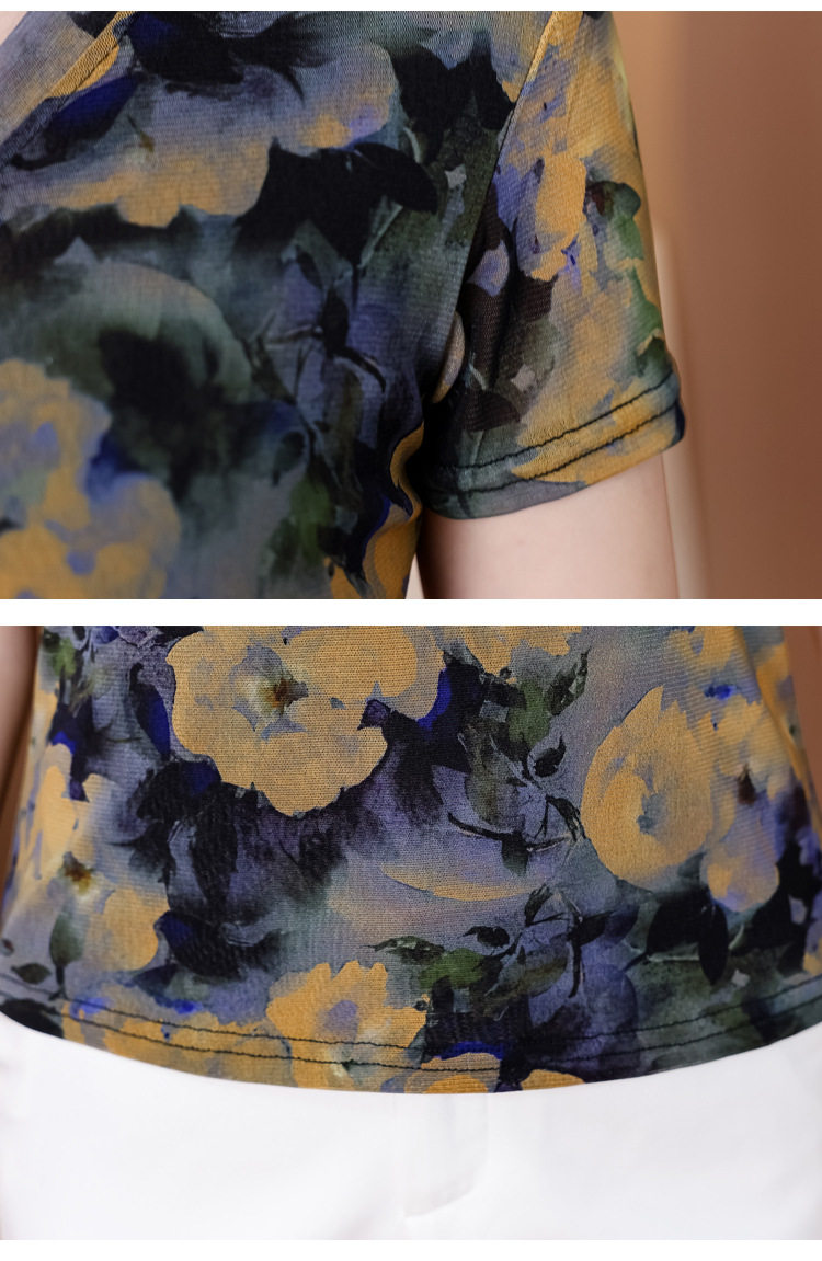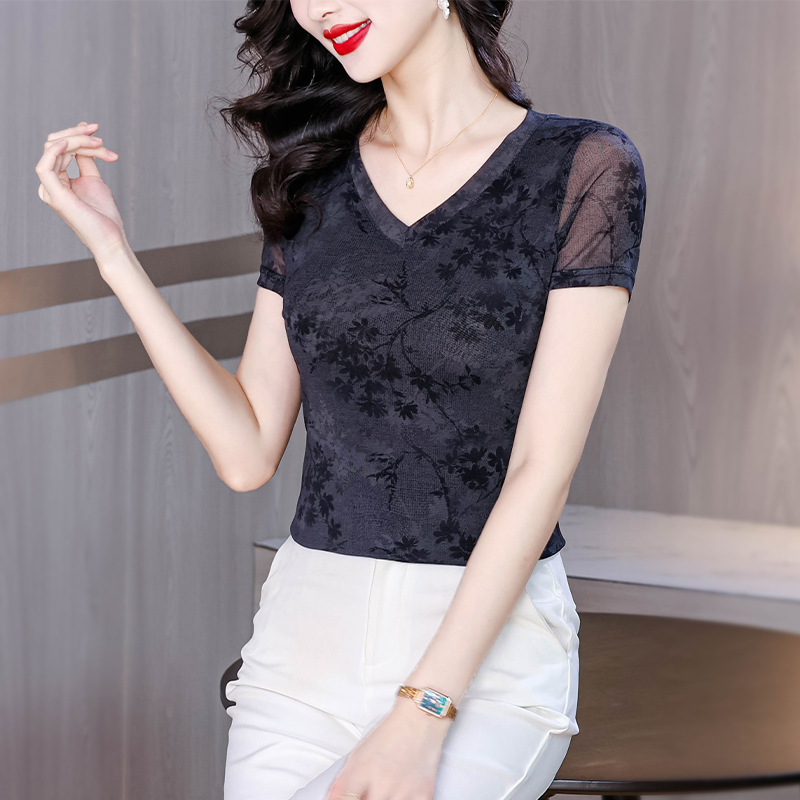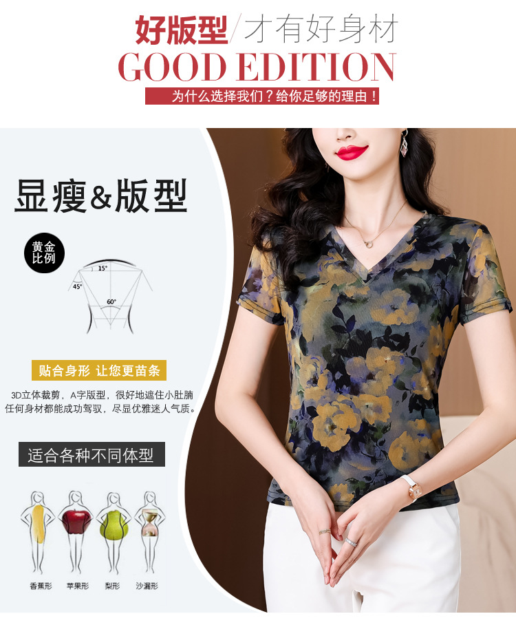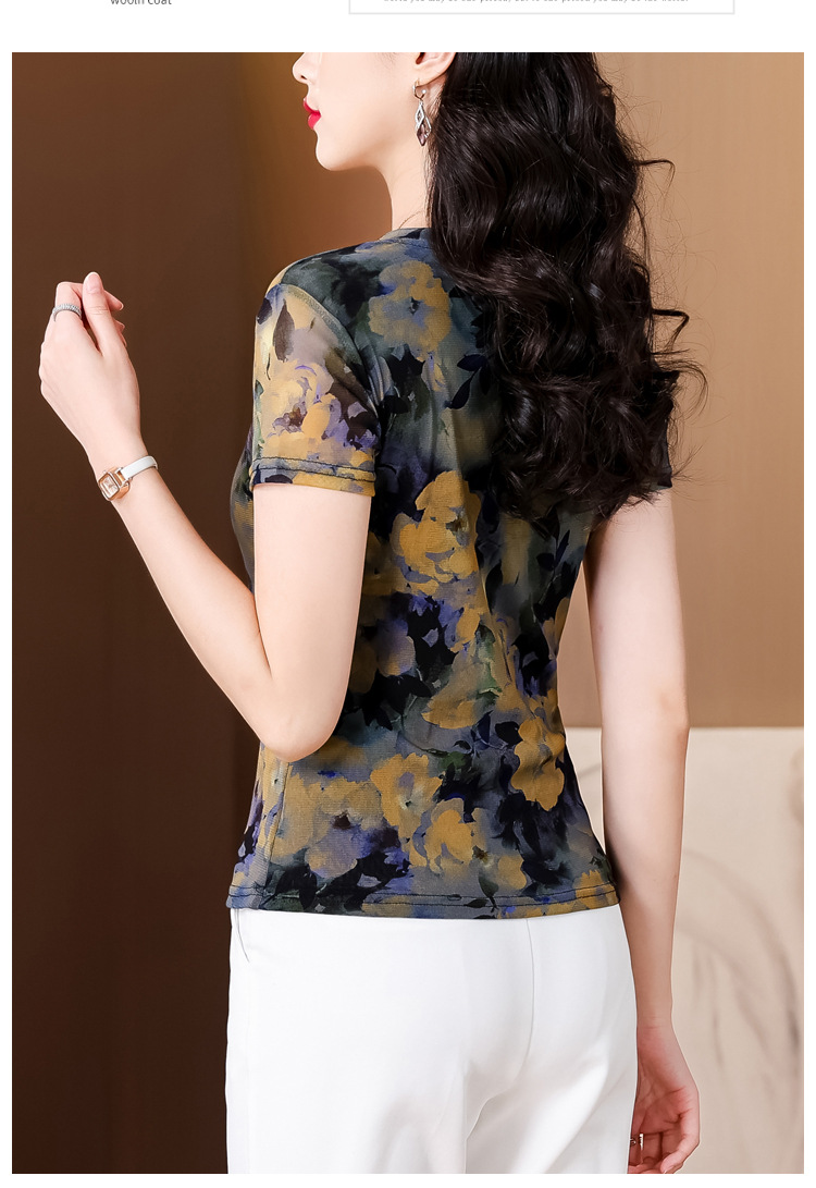 レトロパープルメッシュTシャツレディース半袖夏新作Vネック花柄シャツスリムでスタイリッシュな年齢軽減レディーストップス