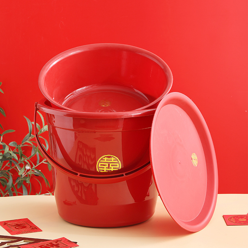 プラスチック家庭用の大サイズの赤いジョーは新居の結婚用品の赤いバケツに蓋付きの喜桶のバケツを持って結婚祝いに持参します。