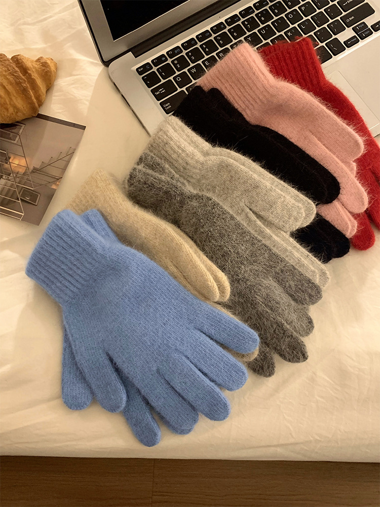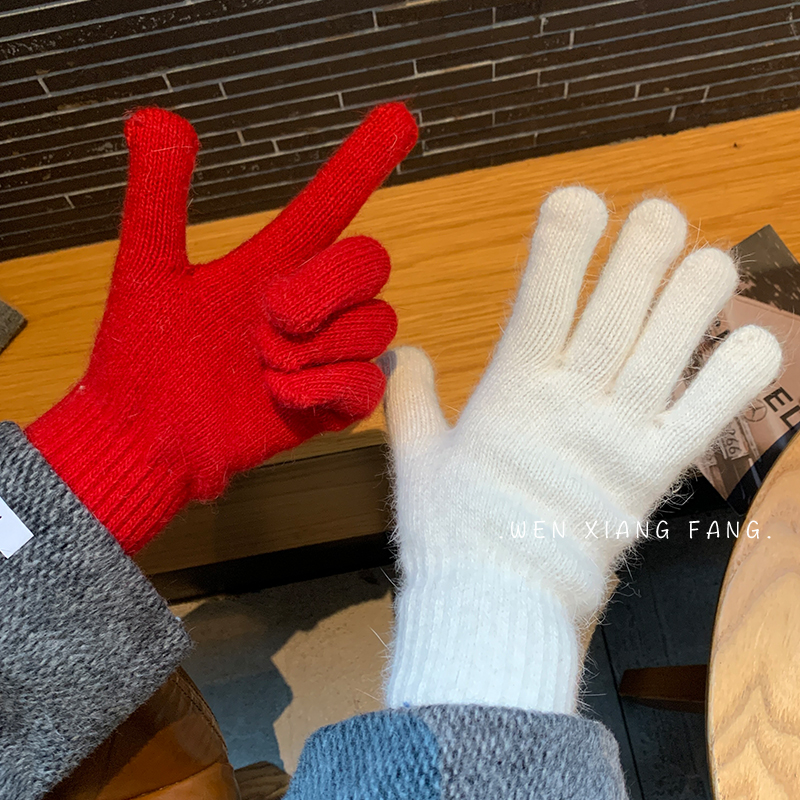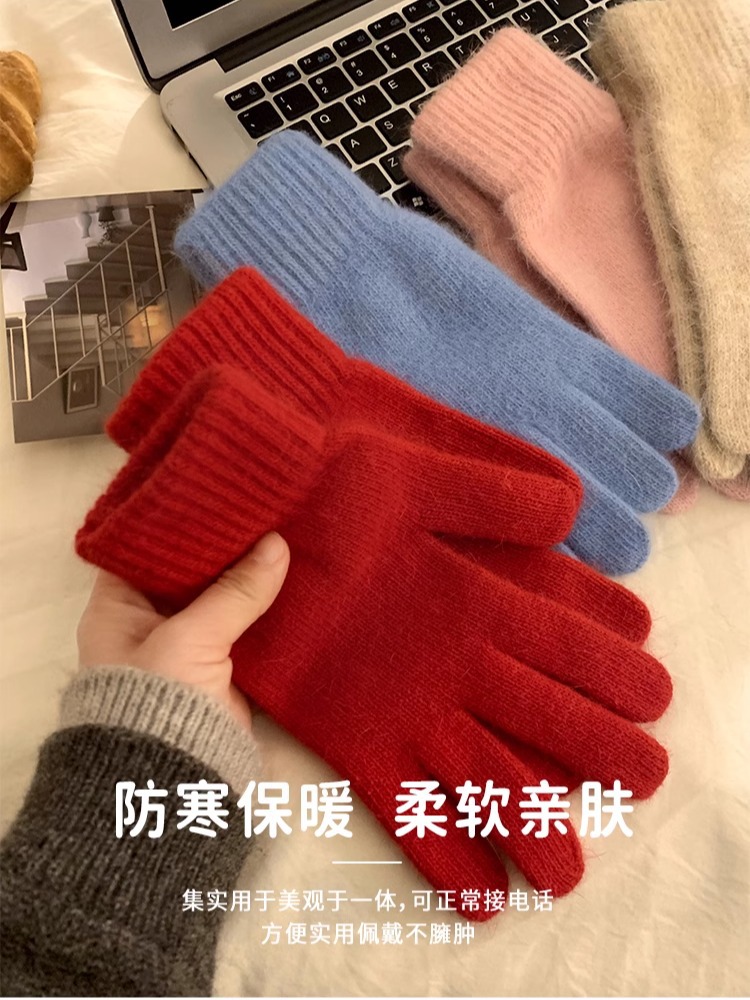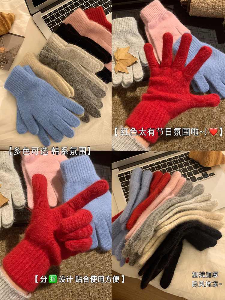 纯色兔毛针织毛线手套女冬季可触屏红色保暖防寒五指新年圣诞加厚