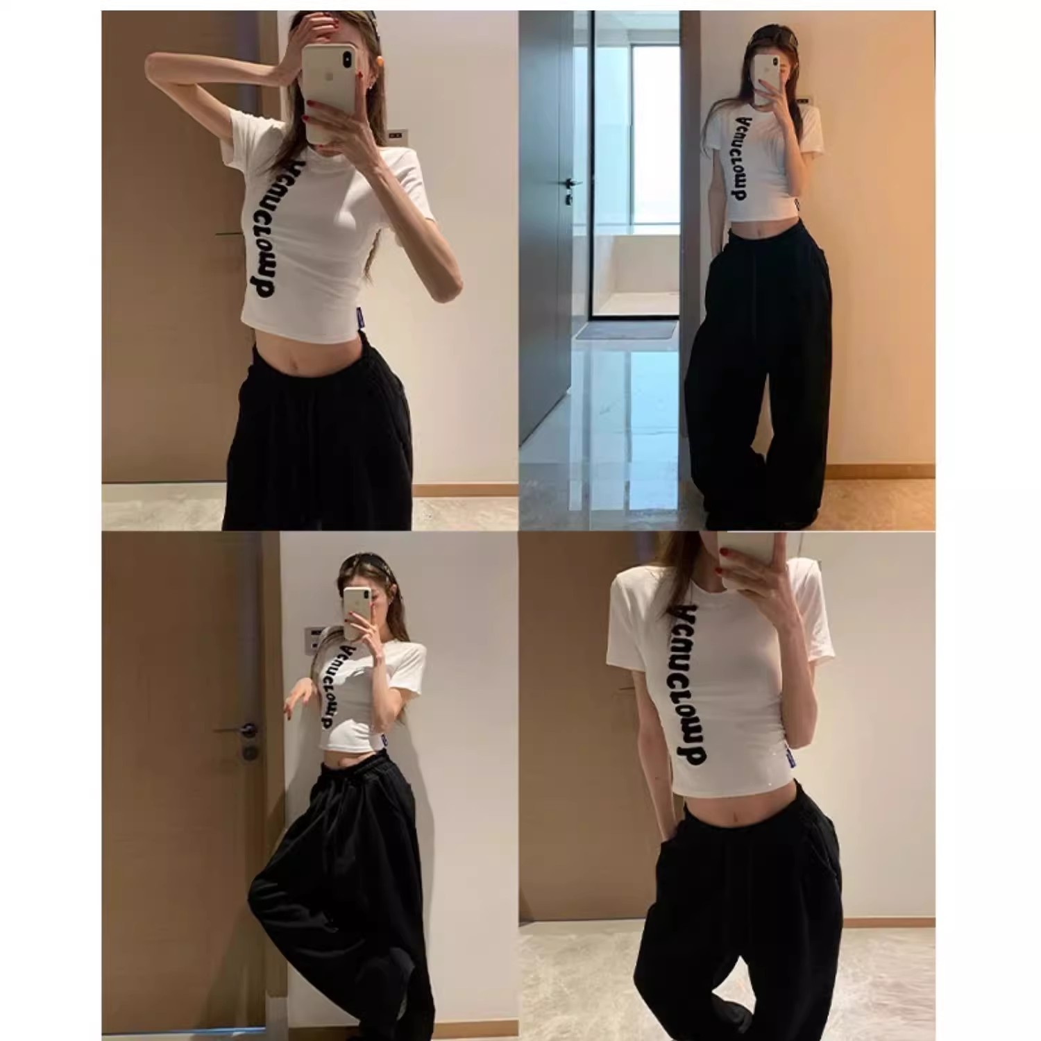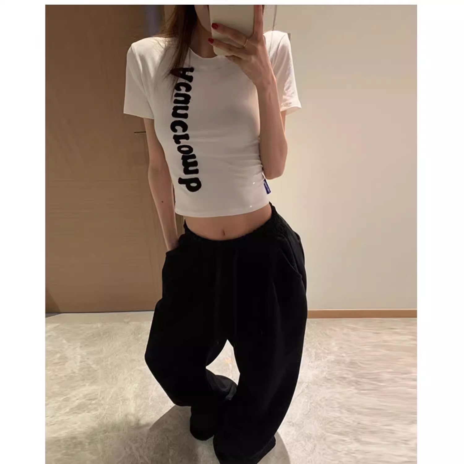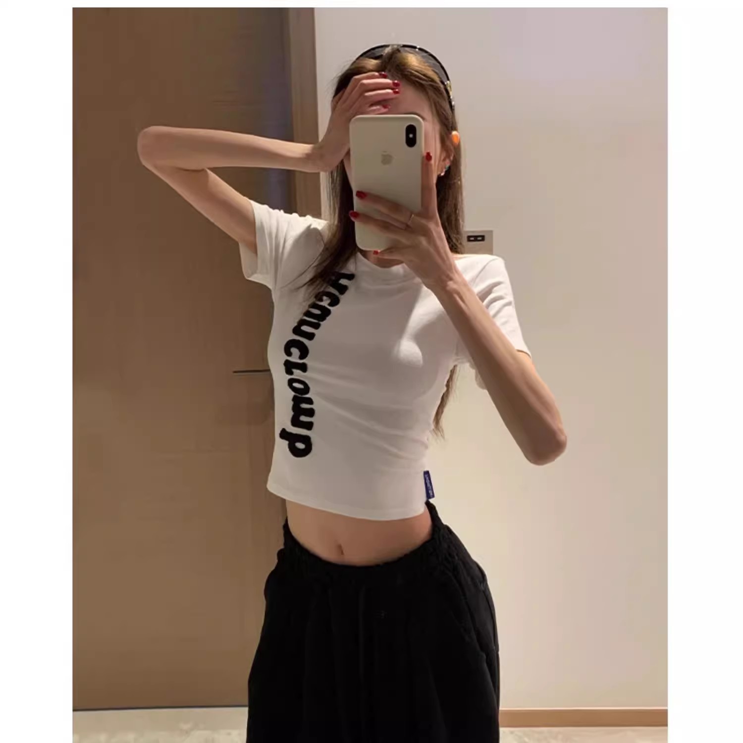 アメリカンホットガールレトロプリントレターフロントショルダー半袖Tシャツレディーススリムデザインニッチカジュアル万能トップ